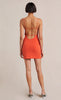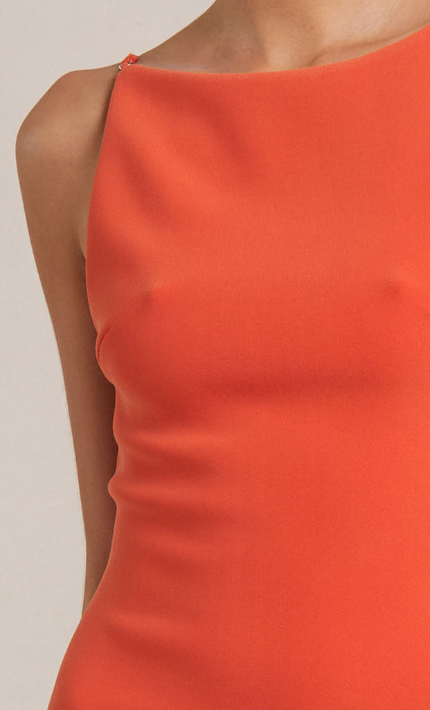 nspired by our best selling silhouette, The Elroy Mini Dress is cut from a sculpted bonded crepe fabric that hugs the body. The dress features a fitted bust with a straight neckline and rouleau strap that leads to a low back.