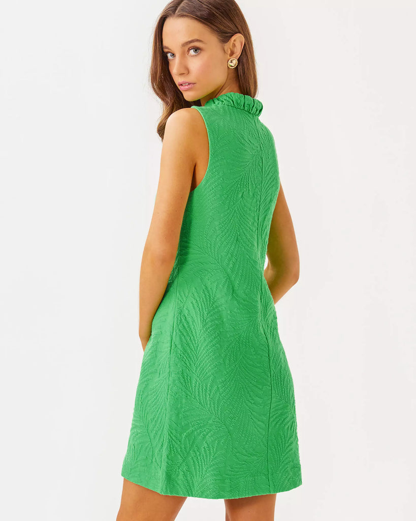 - Straight fit, sleeveless shift dress with a ruffle collar and a half placket with a hidden snap closure.