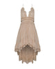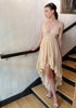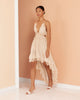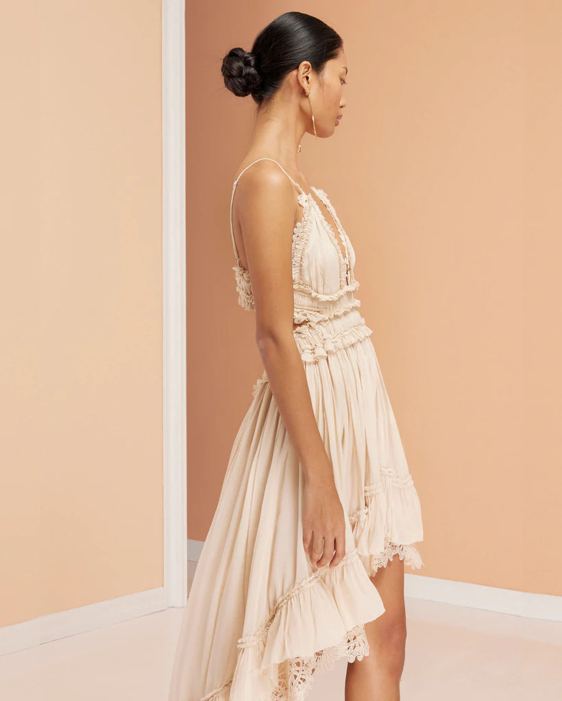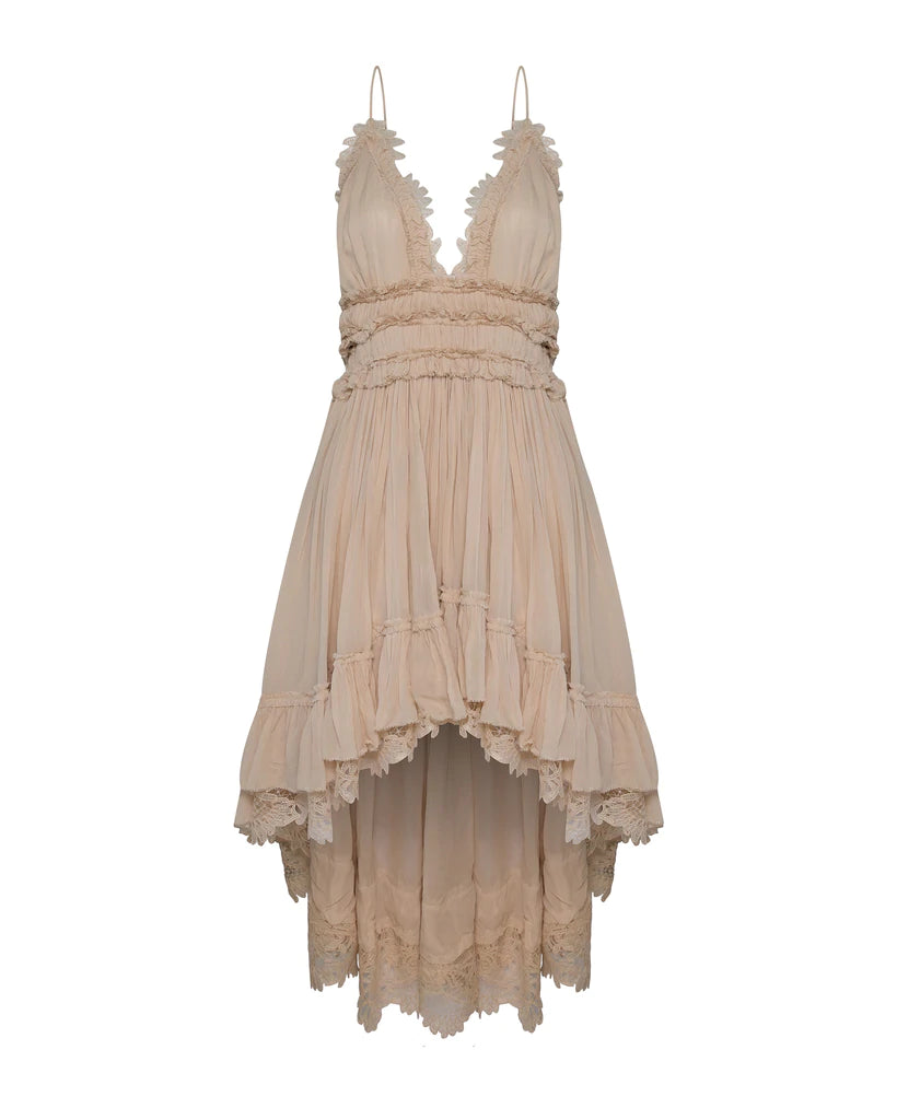 The Emiliana Dress is a continuation of lace and viscose craftsmanship. The dress is designed with a signature high low dipped hem skirt, an open back with adjustable straps and elasticated waistband.