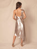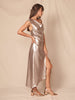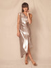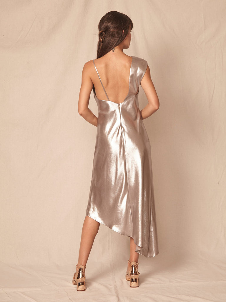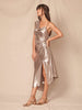 Slip in. Smooth satin luxe drapes this one shoulder slip dress with an asymmetrical hemline and front slit.