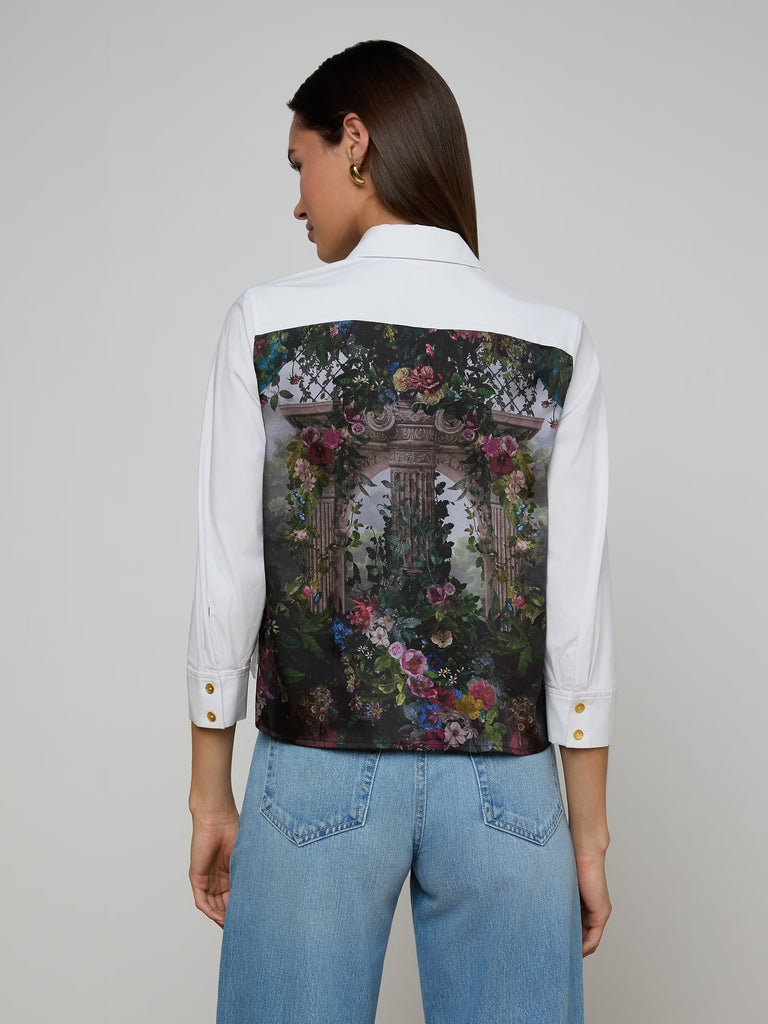 Classic from the front, statement from the back. The Fawn is a white button-down with a striking floral print.