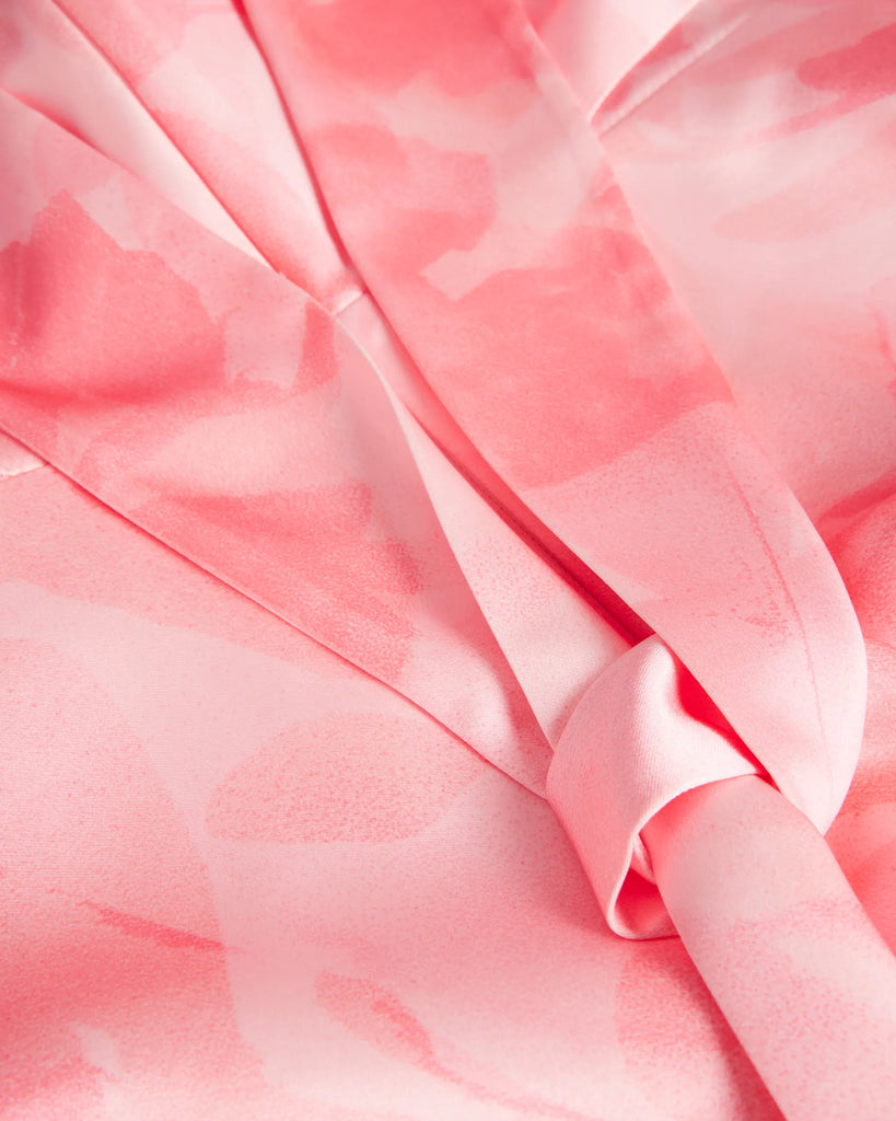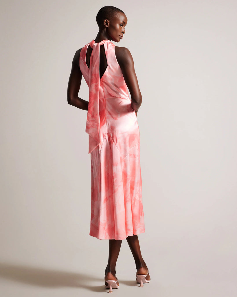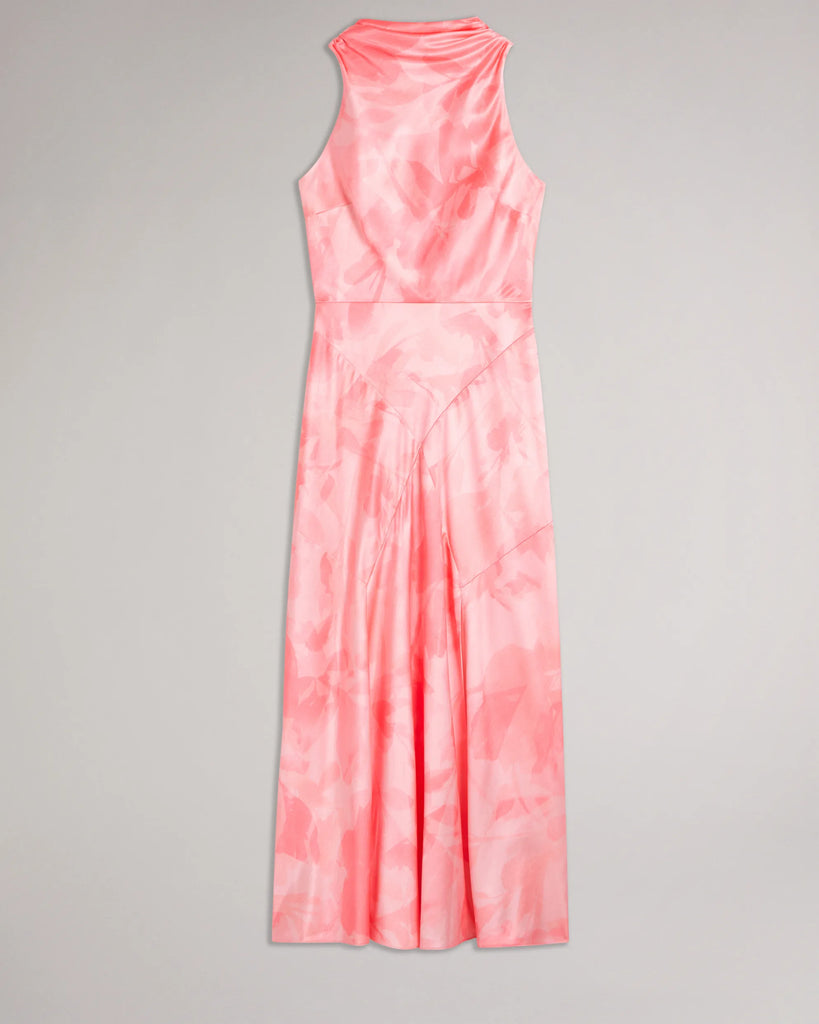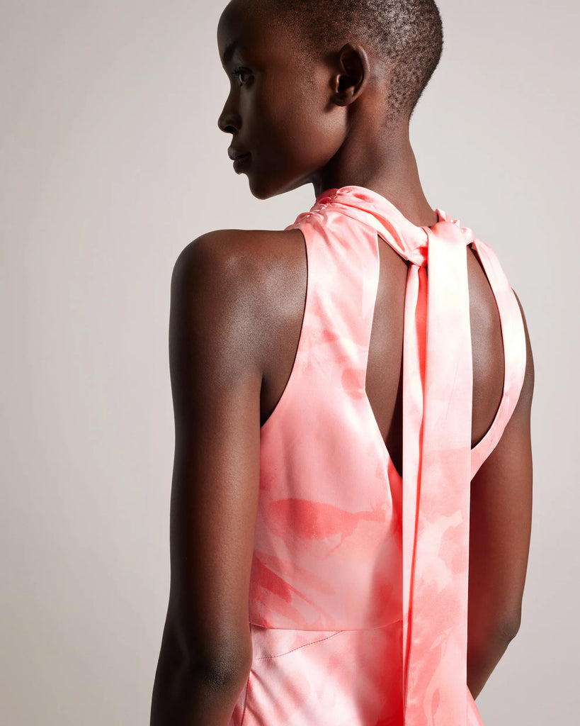 Indulge in luxury with this satin midi dress. FORESTE's blurred floral print and high cowl neck provide a touch of elegance, while the back cut-out and oversized self-tie add a hint of sensuality. The split hem provides a touch of drama to this sleeveless stunner for when making an entrance counts.