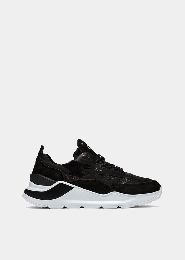 Black nylon Running Sneakers with color matched suede and leather inserts. Black pony skin and fine glitter details. Back patch in black suede with logo, Fuga and D.A.T.E. etched lettering seamed at tongue. Round laces and engraved square logo at back. Leather and cotton terry lining. The 2.5 cm-high raised gel insole allows for optimal comfort. 2-5 cm high sole in Blowtech rubber. All materials used are Made in Italy.