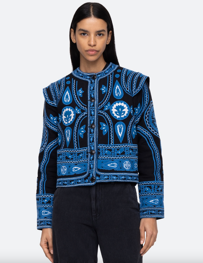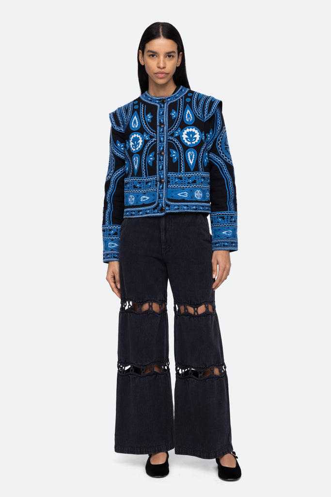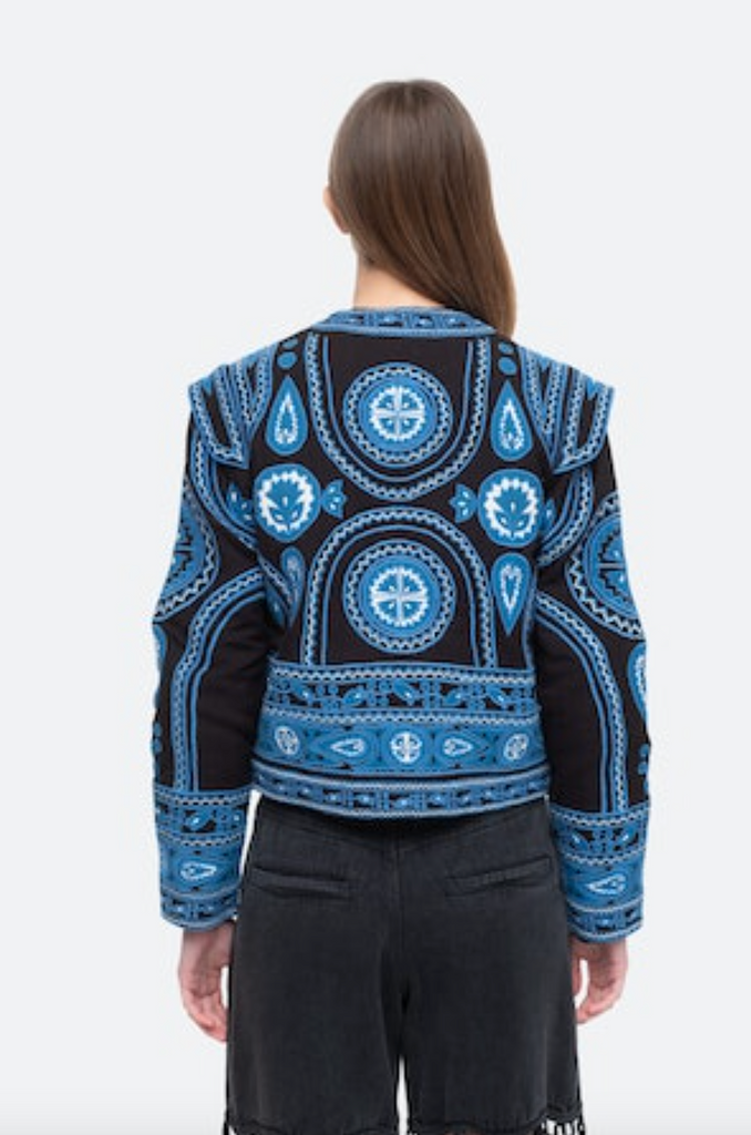 The Gael applique cotton jacket features a bold multi colored applique throughout and extended shoulder silhouette.