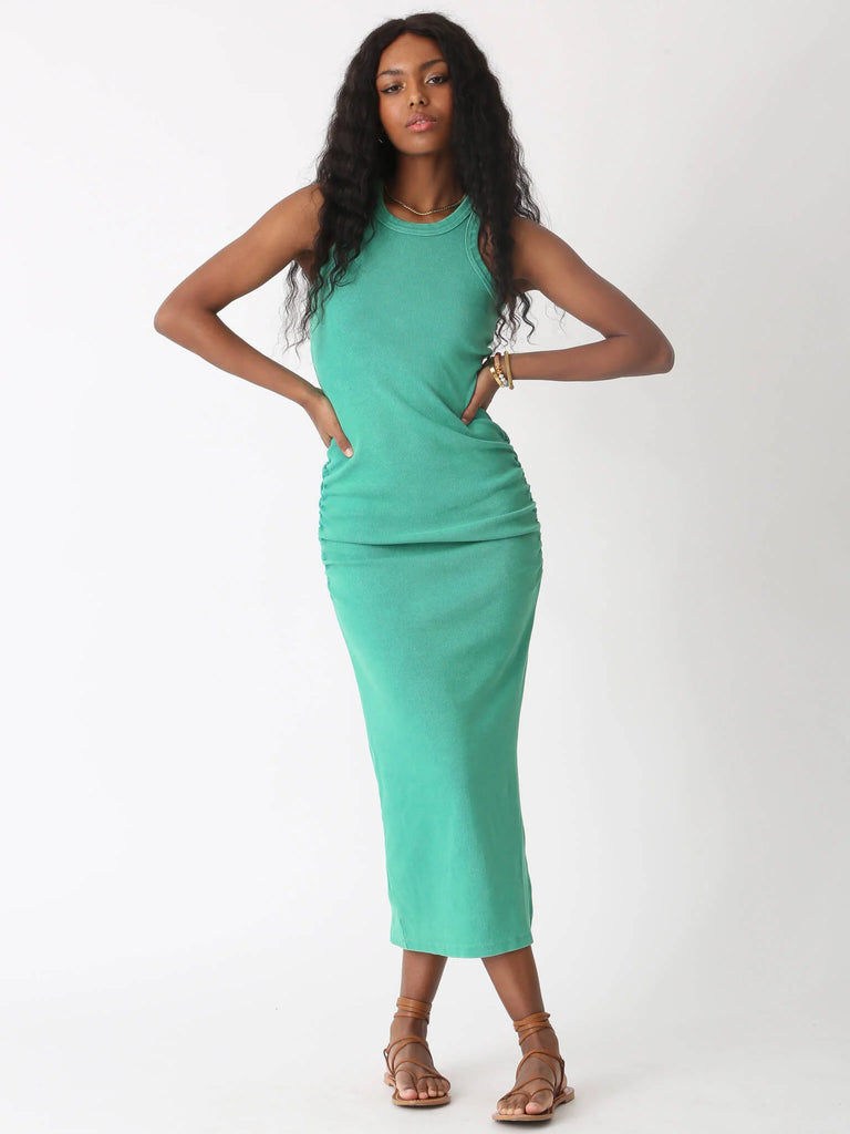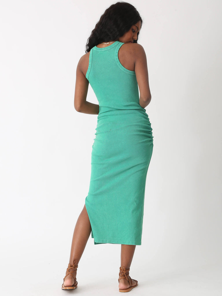 The Gamble dress features our best selling stretch rib, a chic high neckline, and side slit and ruching details to create a dress you'll never have to gamble on.