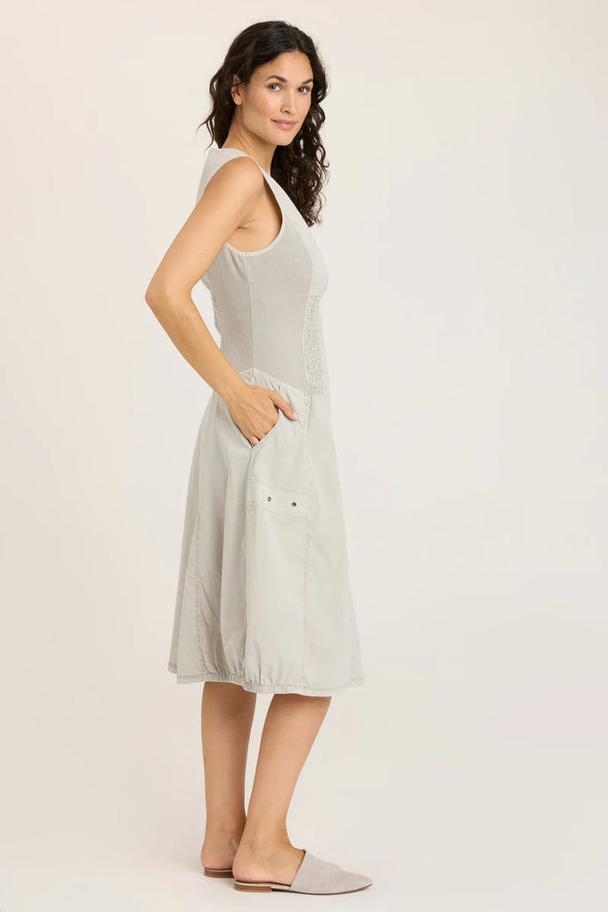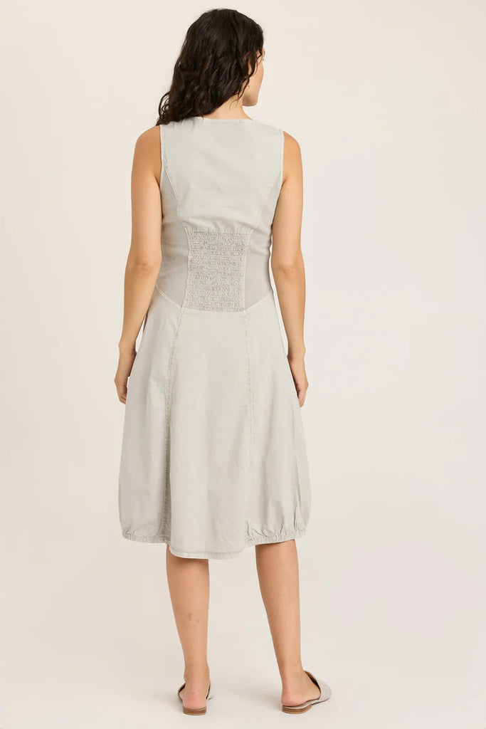 A sleeveless, v-neck midi dress with a bubble skirt, shirring details at front and back, princess line jersey panels for impeccable fit, and two front pockets trimmed with grommets.