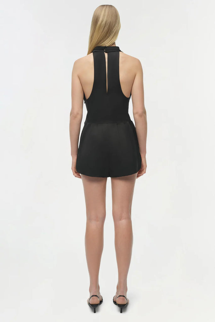 The Halia Draped Satin Romper in Black. This satin halter romper features a softly draped low neckline that flows into fluid shorts and is finished with clean lines for a smooth, minimal look.