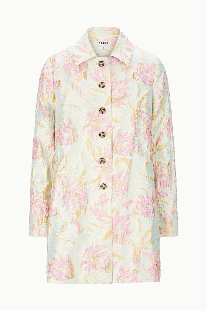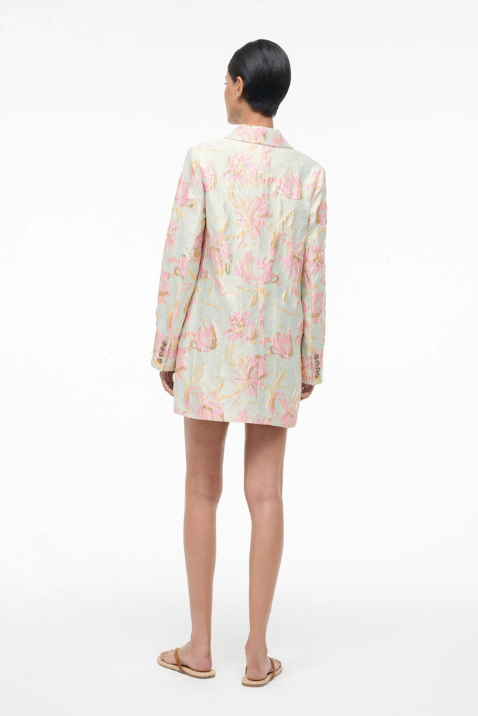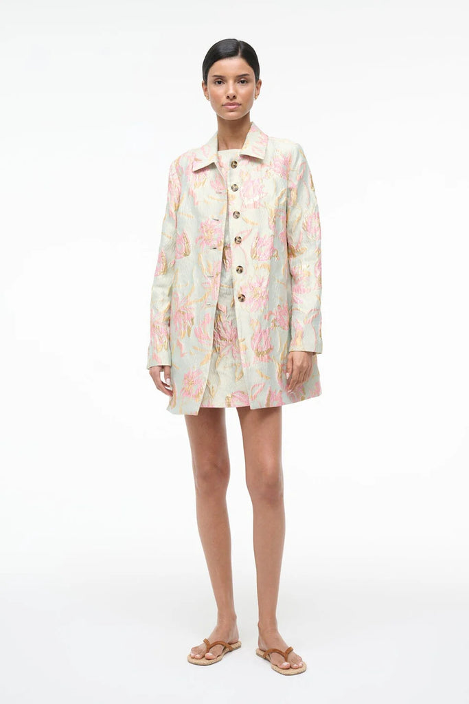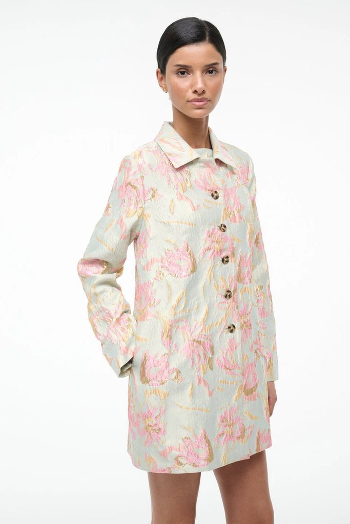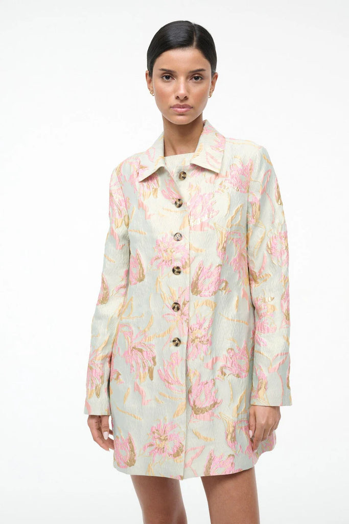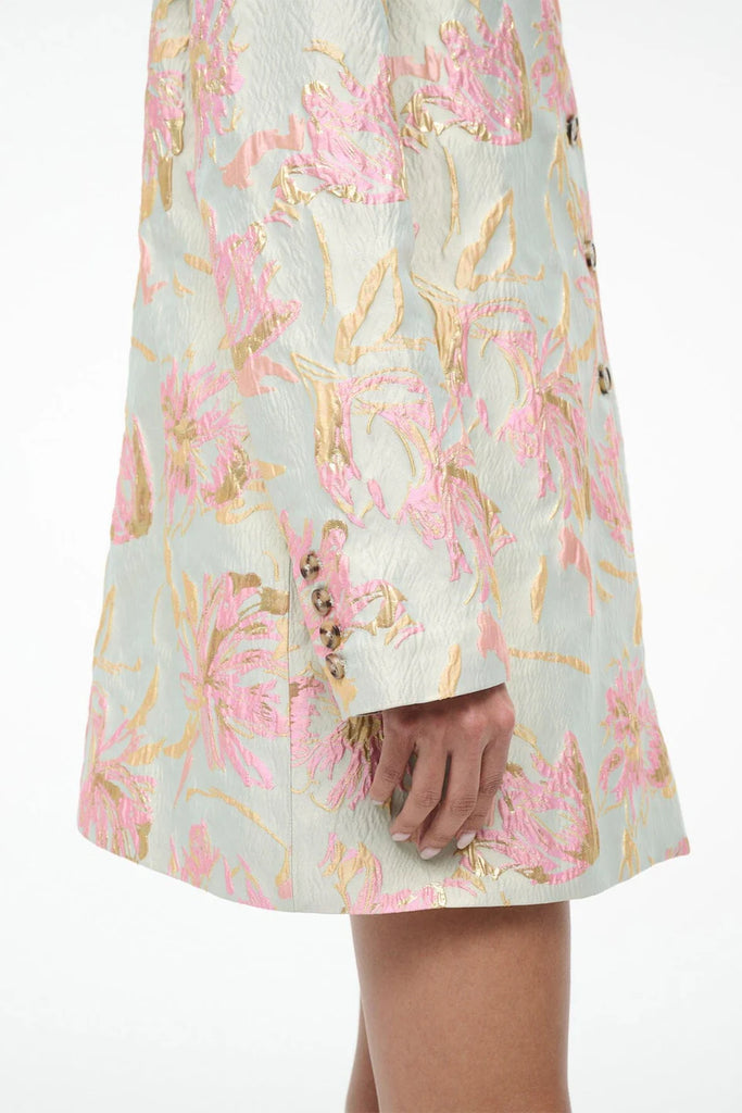 Elevate your outfit with this floral metallic brocade jacket, featuring striking contrast buttons that add dimension and polish. Designed to coordinate seamlessly with the matching Mimi Dress, it's the perfect layering piece.