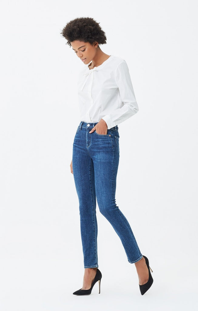 New for Fall, the Harlow features a high-rise with a full length, slim leg. Crafted from SCULPT stretch denim which utilizes a one-of-a-kind Lycra technology, this fabric is formulated to uplift the body and create a long lasting fit that does not stretch out. The Carmel wash is a medium blue with subtle whiskering.