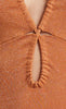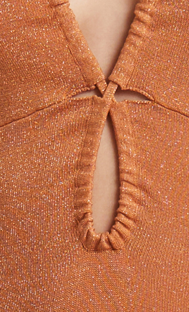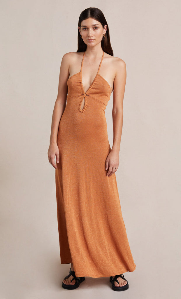 The Indya Knit Maxi Dress is a statement tear-drop maxi dress cut from a shimmering, ribbed knit metallic fabric. The dress features an under-bust tear cut away, a drawstring bodice and a V-neck halter that ties at the neck. The dress is completed with a slightly flared hem.