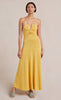 The Indya Knit Maxi Dress is a statement tear-drop maxi dress cut from a shimmering, ribbed knit metallic fabric. The dress features an under-bust tear cut away, a drawstring bodice and a V-neck halter that ties at the neck. The dress is completed with a slightly flared hem.