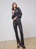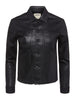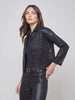 A slim, subtly lustrous coated-denim jacket in a saturated black. A crop cut, front angled seaming and welt pockets define the waist, accentuating an hourglass shape. Includes hems with clean raw edges, double-stitched chest pockets and cuffed three-quarter sleeves. Fastens in front with matte-black buttons.