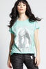Let’s rock out with this tee based off of Janis Joplin’s iconic song, “Move Over”. The song is from her album, “Pearl” which was released in 1971. In addition to the bright, mint color and large graphic of Janis, the tee is made with soft cotton fabric, distressed hems, a ribbed crew neckline, rolled sleeves, and a fitted fit.