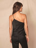 This romantic camisole features an asymmetrical hem and one shoulder neckline in lustrous crepe satin.