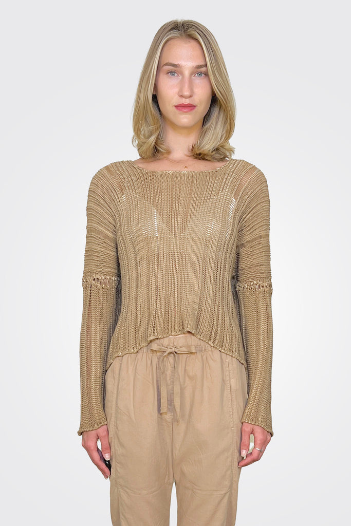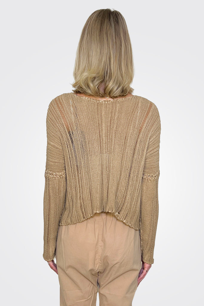 A distressed, structured knit tunic with hand-stitched sleeves. An edgy, yet casual tunic from our current spring-summer collection that will elevate any outfit.