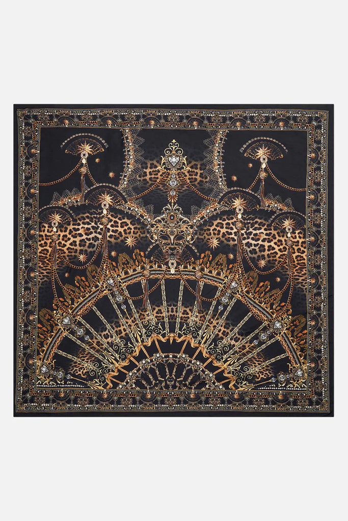 The Masked At Moonlight Large Square Scarf is a decadent dance of black and gold artistry. Lacework of chains and charms form intricate Venetian masks and fans to reveal lavish leopard. Experience the epitome of luxury with our CAMILLA silk scarf, embellished with signature crystal adornments. This exquisite scarf features a large expanse, allowing for versatile styling options. With custom border detail, it exudes an air of sophistication. This multi-functional accessory can be worn as a neck scarf, used as a stylish sarong over swimwear, or skillfully transformed into a top for a chic summer styling. Explore our style guide to unlock endless possibilities and discover more ways to wear this perennially perfect CAMILLA staple piece. Elevate your style with the addition of this lavish printed silk scarf. Lovingly crafted, designed in Australia. Explore more from the Amore Mio collection.