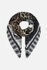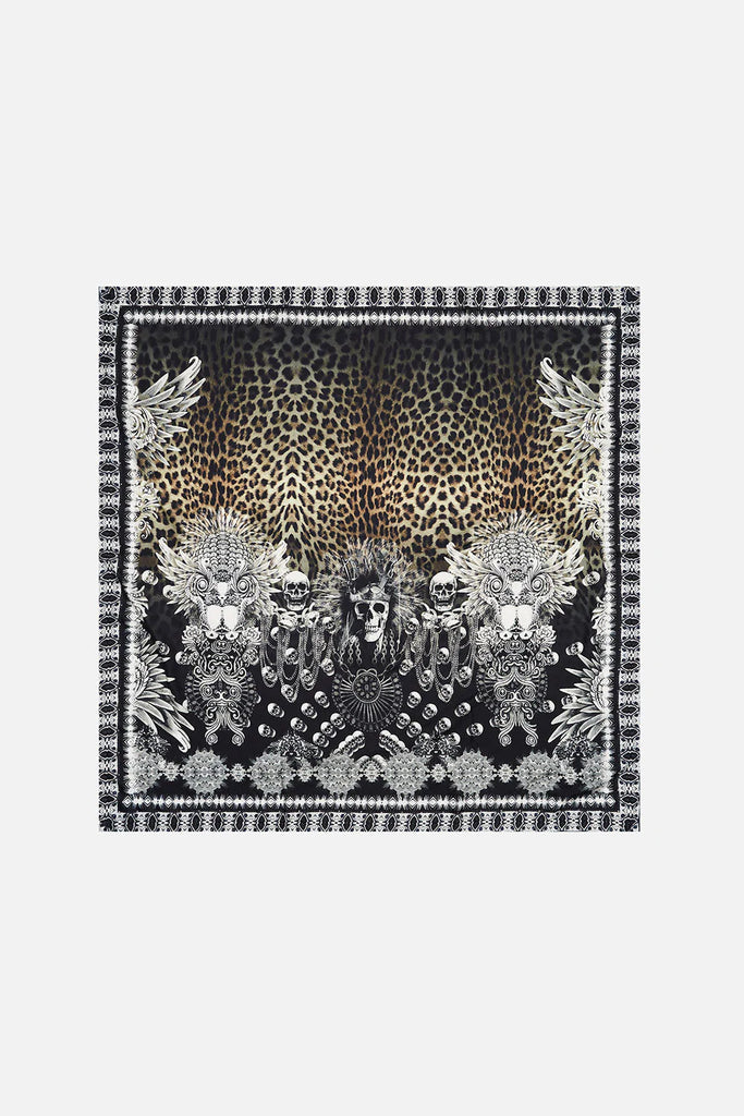 Upping the ante with grungy necklines, the Order Of Disorder Large Square Scarf captures the gaze with a deep shade of midnight adorning leopard print, ivory-dipped skulls, metallic chain details and wispy featherings. Hand-embellished with crystal adornments, this luxury silk scarf features a large expanse, contrasting trim, signature CAMILLA shimmer and a multi-wear design. shift it into a variety of summer tops.