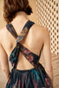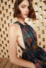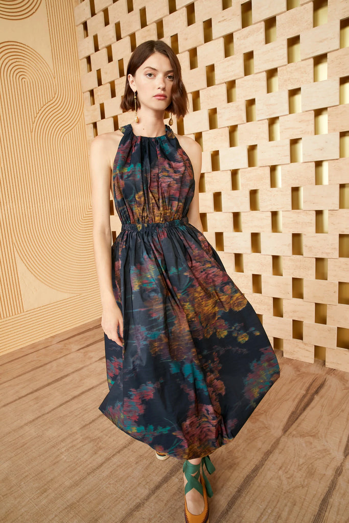 the Leyna Dress features fabric made in France with warp printing, a technique in which yarns are printed before being woven together, producing a pattern that looks as if the colors are melting into one another. This structured fabric allows the silhouette to retain its shape while simultaneously creating a sense of movement. This bubble-hem dress has a high neckline and an open, crisscrossed back. It is finished with side seam pockets, side seam zipper, and an elastic waist.