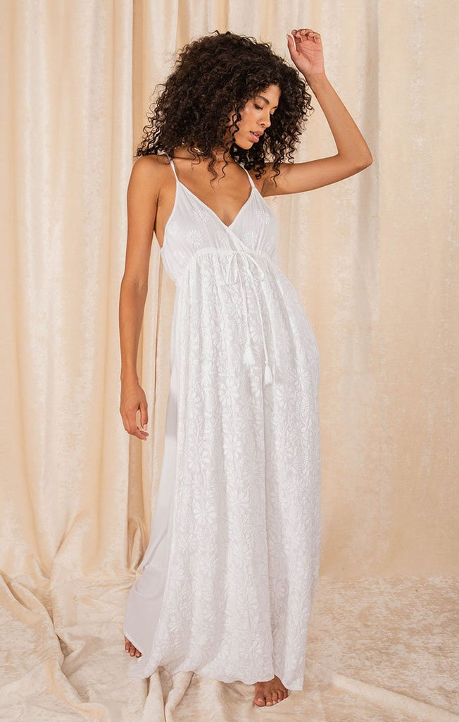 Feel dreamy draped in enchanting floral embroidery & a flattering empire drawstring waist.