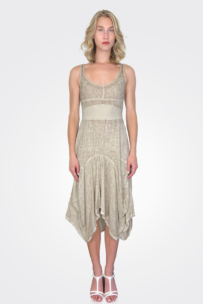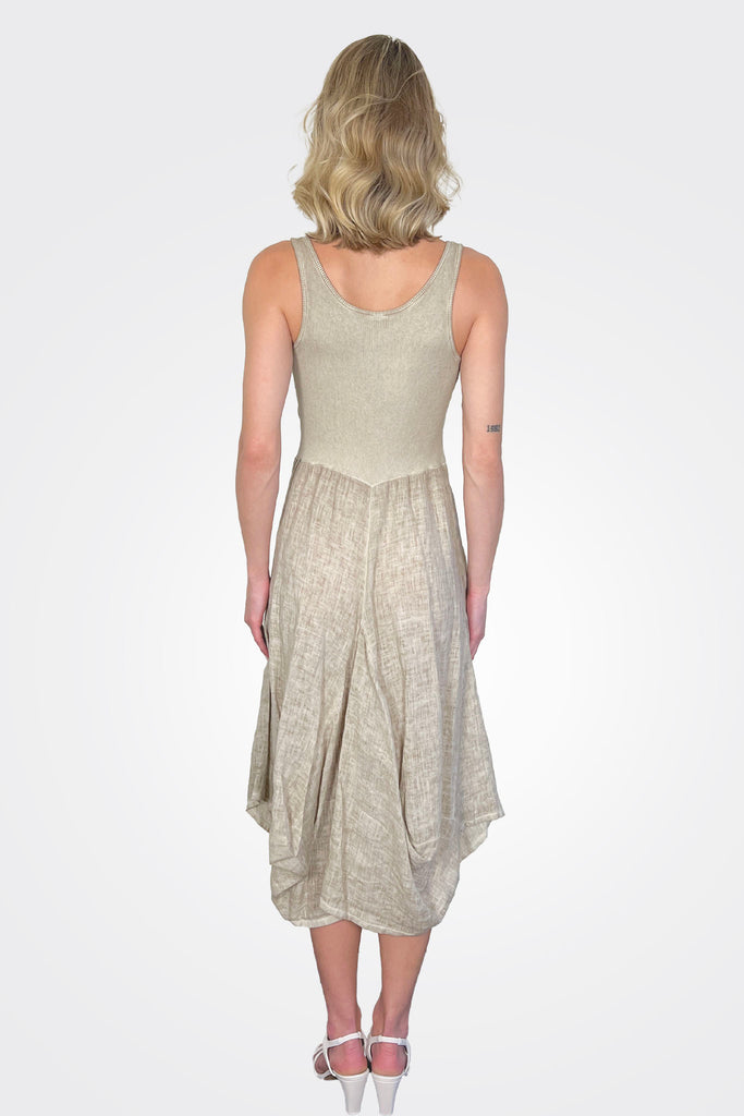 Inizio’s Linen Magic Dress flaunts a great style from Italian linen dressmaker, Inizio. Linen doubled skirt with funky puffed style, two generous pockets in front, cotton baby rib top and no sleeves.