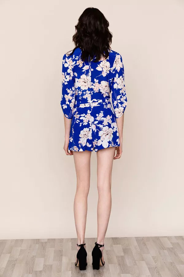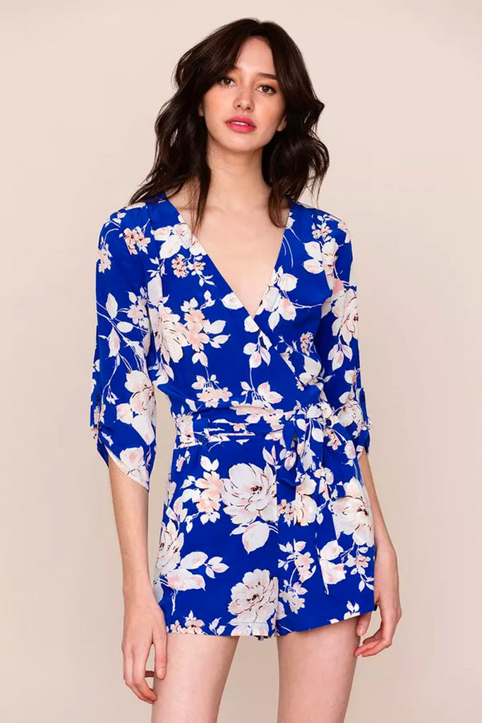 A classy yet playful closet must-have floral romper that creates a chic alternative to the dress. Details include a cross over v-neck with a hidden snap closure, matching tie belt, adjustable tab sleeves, and side pockets.