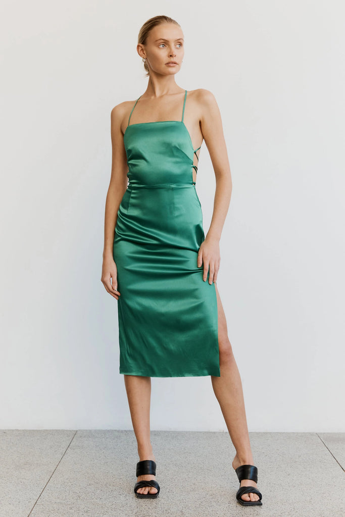will make an entrance at your next event. With a slim bodycon silhouette cut in luxurious sateen fabrication, featuring a straight cut neckline balanced by an open back with crossed lace-up ties.