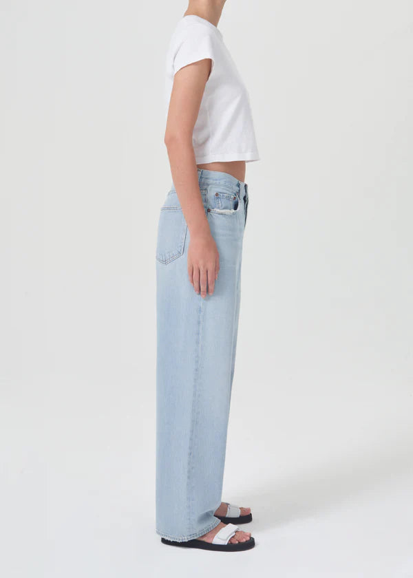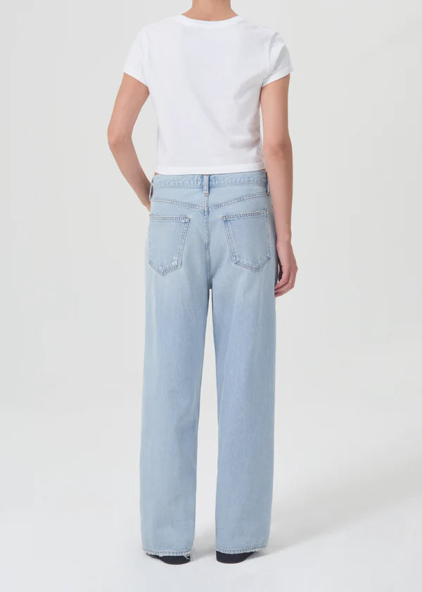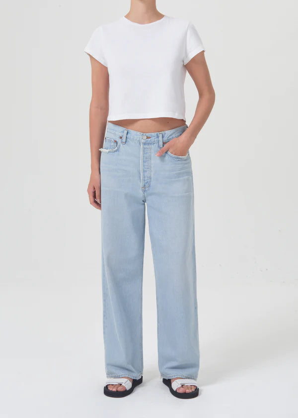 Looks Like: Faded light indigo with soft whiskering and a finished hem