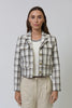 This cropped plaid jacket features a textured woven fabric, chest pockets with button details, and a modern fit that layers effortlessly over knits for a polished, professional look.