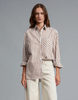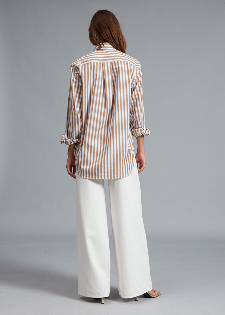 Timeless. Authentic. Iconic. One of the building blocks of a perfect wardrobe. A true wardrobe staple, this poplin button down Icon is a classic, perfected. Featuring banker stripes and a chevron front pocket detail for added dimension. Subtle gathering around the cuffs gives this traditionally masculine shirt a subtly feminine touch. Pairs perfectly under a sweater-vest or military jacket. Crafted from 100% cotton with a relaxed fit.