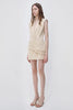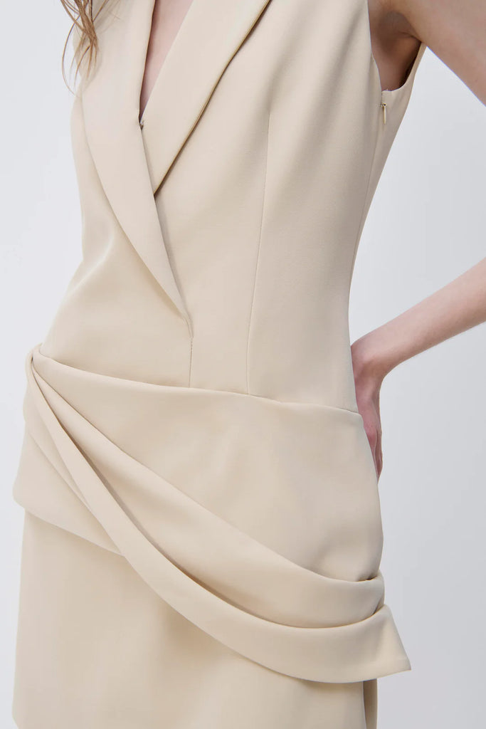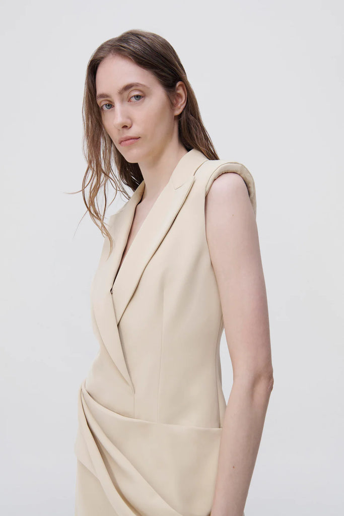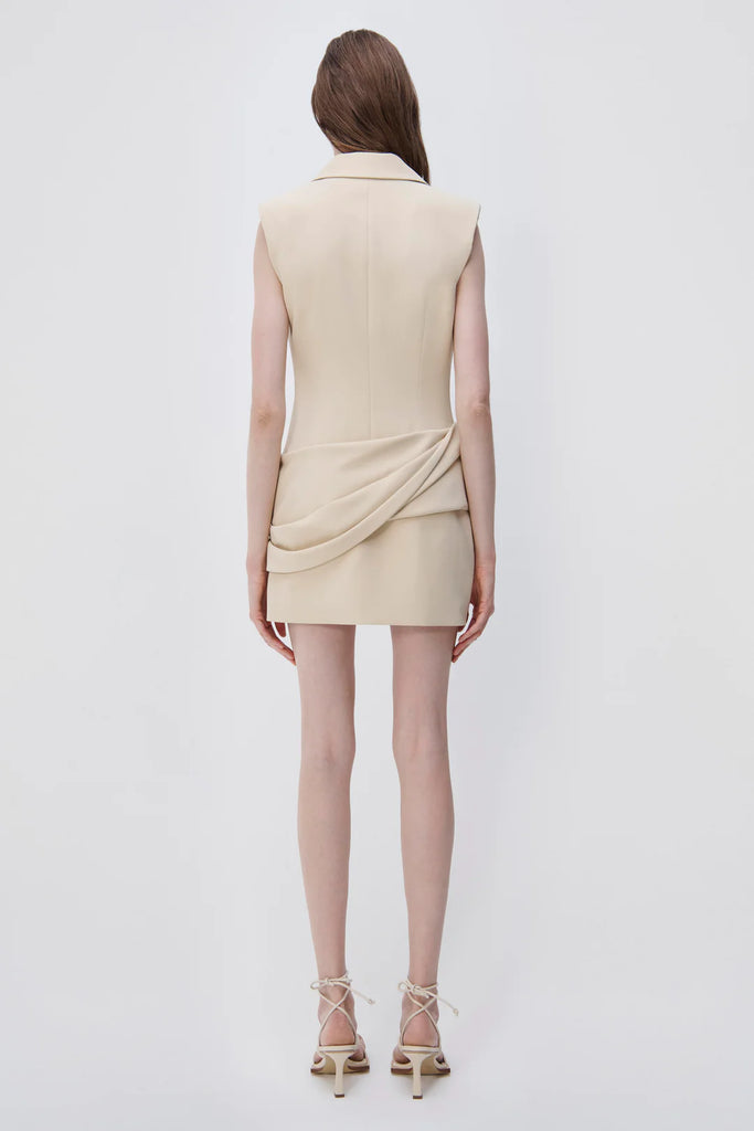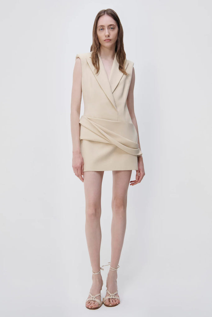 The Messina Blazer Mini Dress in Dried Pineapple. Sleeveless blazer mini dress with lightly padded shoulders. Modern tailoring heightens the immediacy of deconstructed suiting, crafted from a technical cocktail crepe for versatility and longevity.