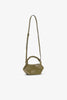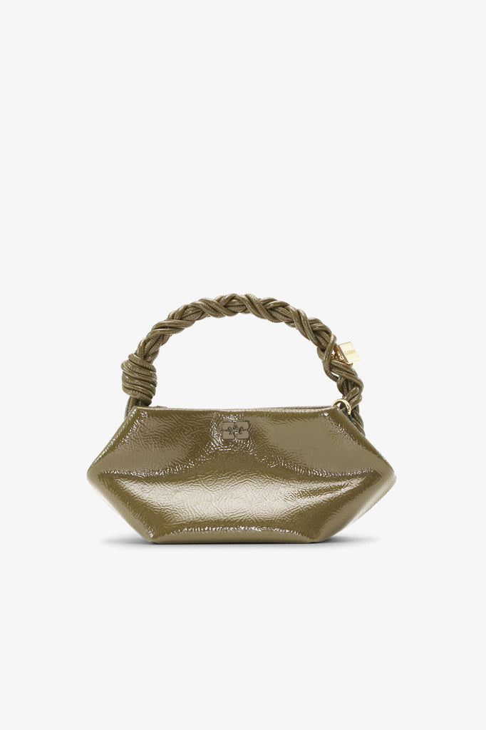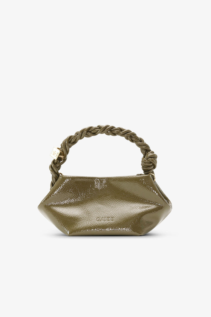 This Olive Green Mini GANNI Bou Bag features a tone-on-tone metallic GANNI Butterfly logo, a twisted handle with a braided knot, and a gold-tone metallic dice with a GANNI Butterfly logo engraved. The bag has an internal magnetic closure, a flat card pocket inside, and an adjustable and removable shoulder strap for crossbody wear.