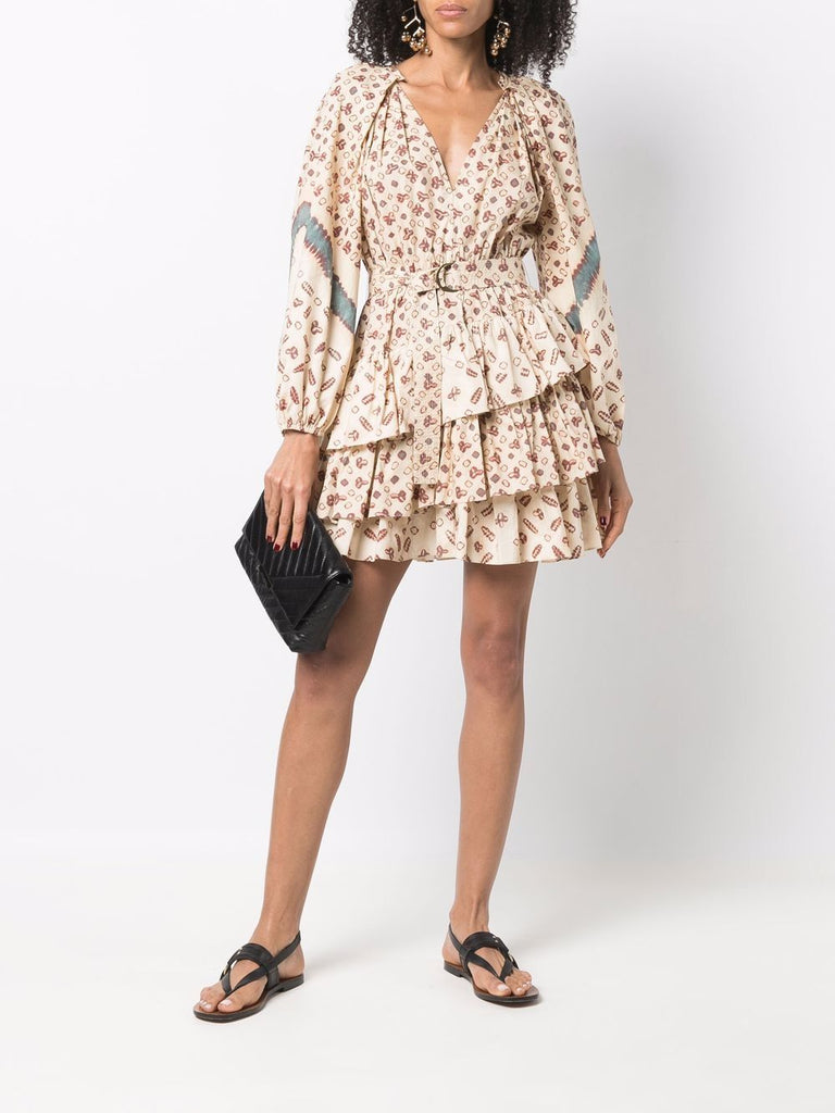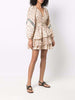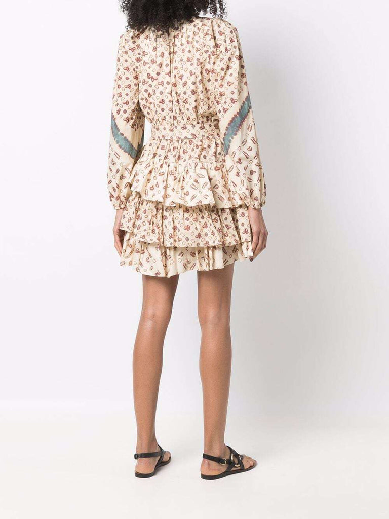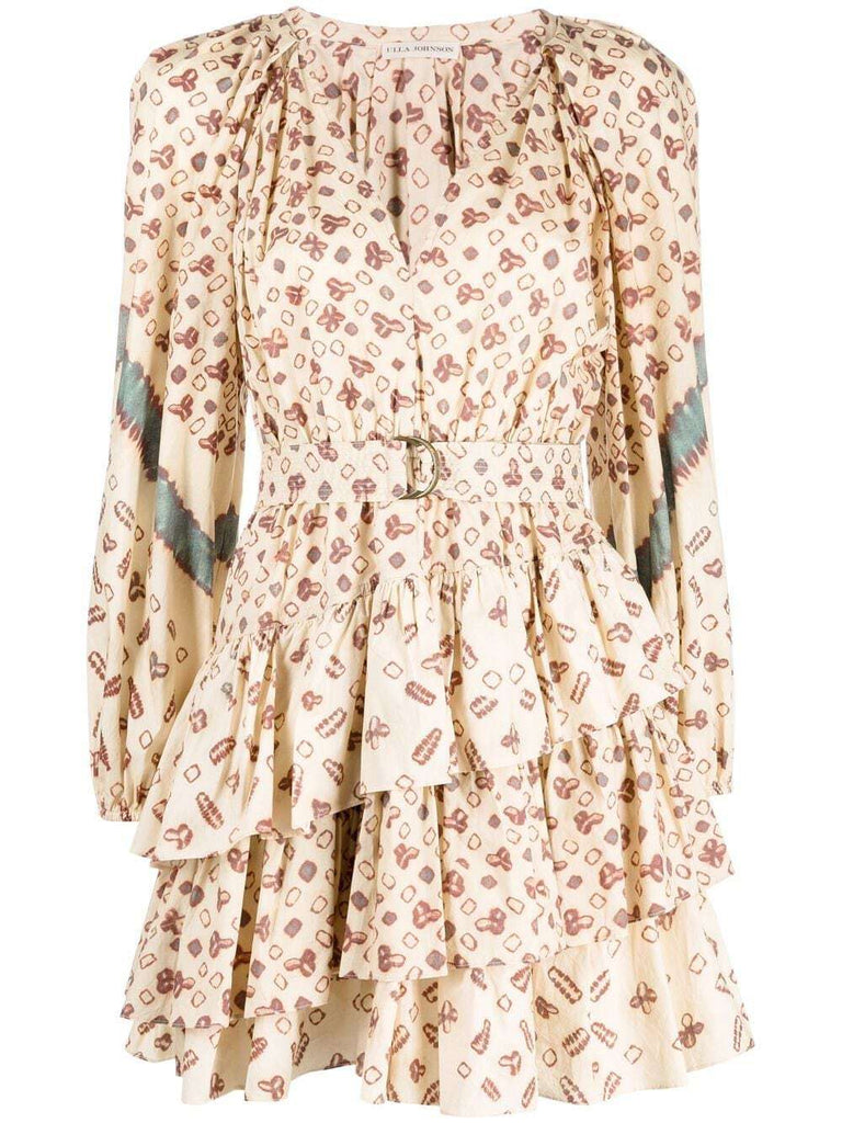 The Miranda Dress is cut in breathable cotton poplin and patterned in our Ultramarine chevron Shibori print. This mini has an assymetrically tiered ruffle skirt, finished with an uneven hem to add movement. Features a split neckline and full raglan sleeves. The belt is removable. Composition: 100% Cotton.