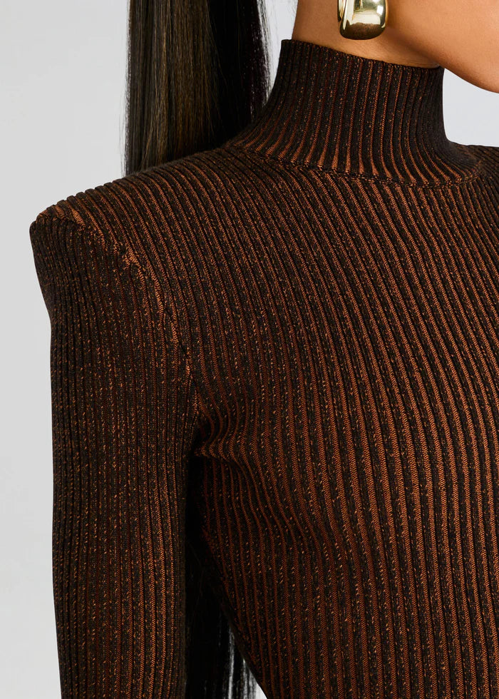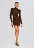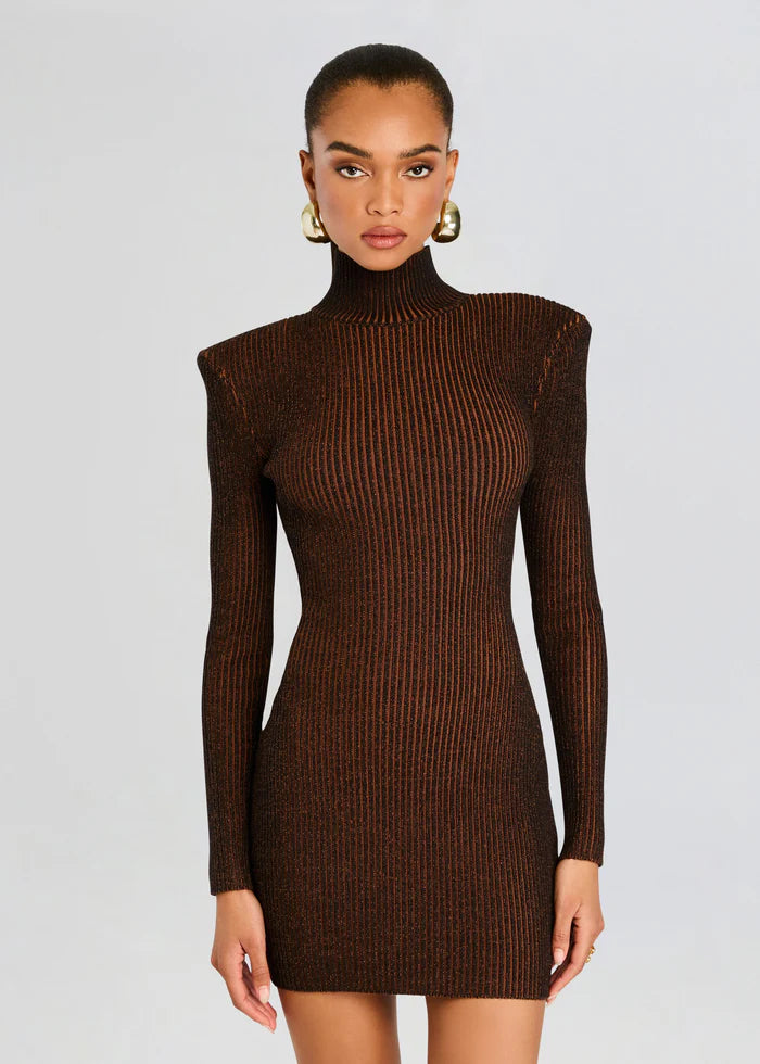 Step into sophistication with SER.O.YA’s Moda Dress. This alluring bodycon mini dress is crafted from a ribbed material, adorned with stylish shoulder pads, and designed with elegant long sleeves. This dress is a perfect piece to achieve a polished yet fashionable look, promising to enhance your curves and elevate your style. Shown here in Camel/Black.