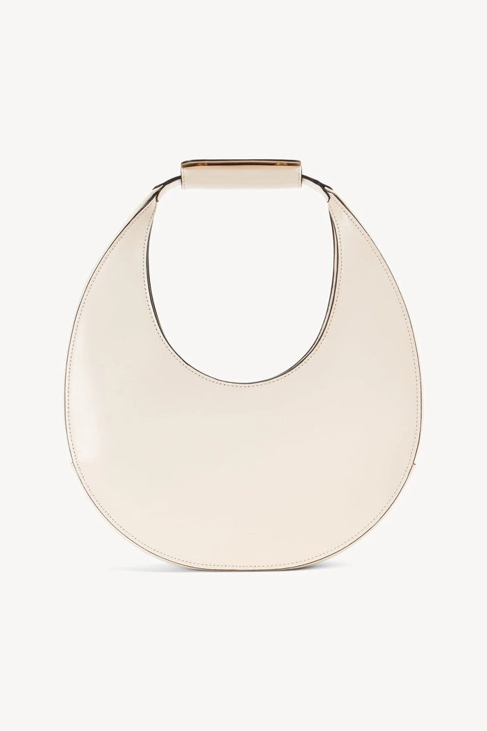 The Moon Bag features a curved handle with a removable STAUD embossed accent. Designed in a crescent moon shape with inner suede lining and a magnetic clasp closure to hold your essentials.
