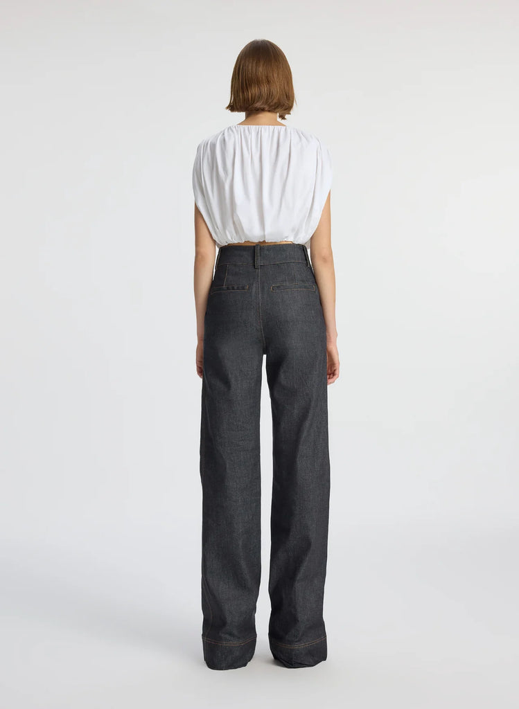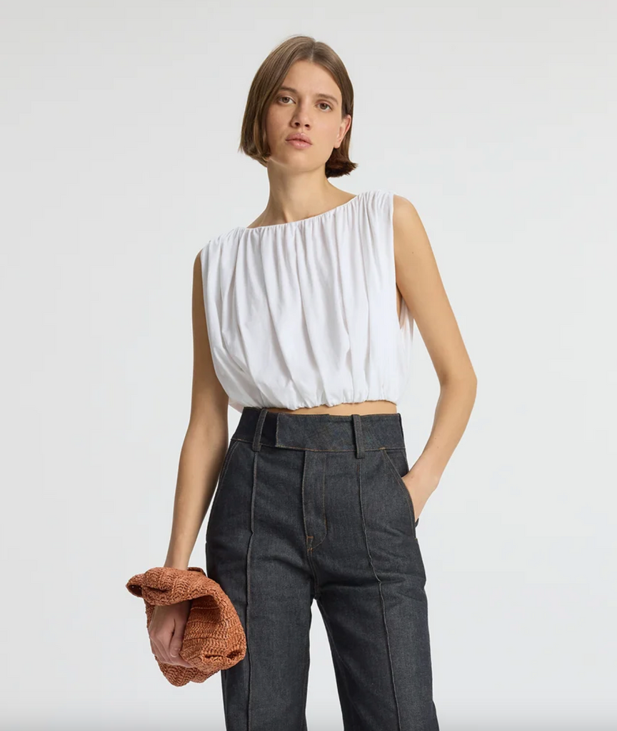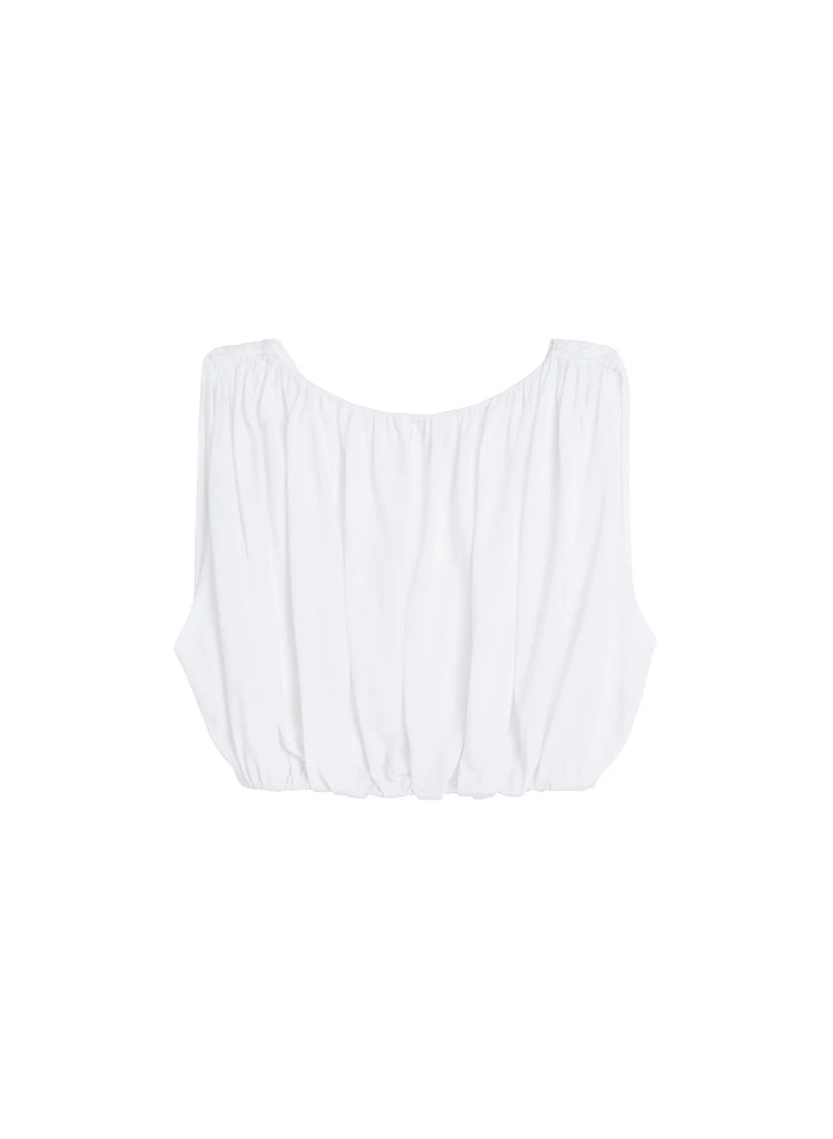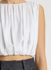 The Nell Top is crafted from clean-finish jersey fabric in wardrobe-essential white. This cropped, sleeveless silhouette makes a warm-weather statement, featuring a high neckline and beautiful gathering. An encased elastic bubble hemline makes for a voluminous and nostalgic finish