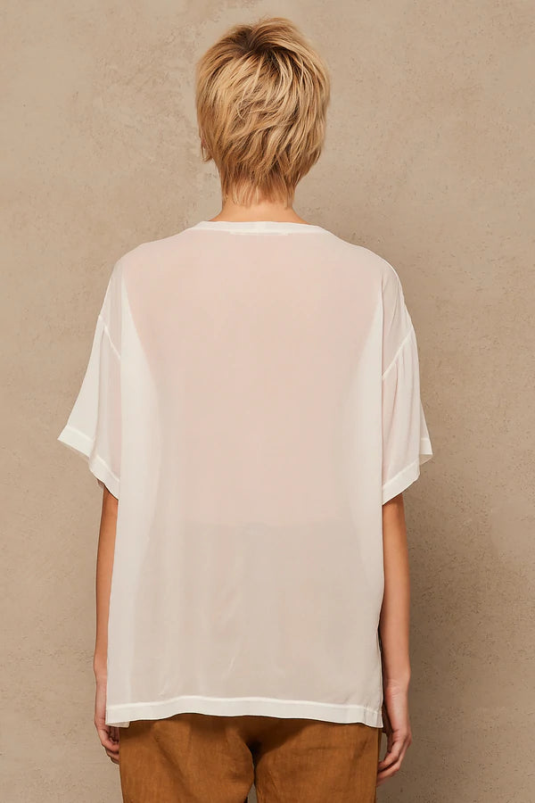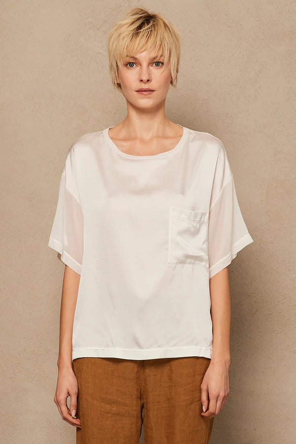 Stretch silk satin shirt, garment-dyed for an aged effect. Oversize, with low shoulders. Silk georgette inserts on the boat neck. Satin appliqué pocket on the front. Vents in the hem at the sides.