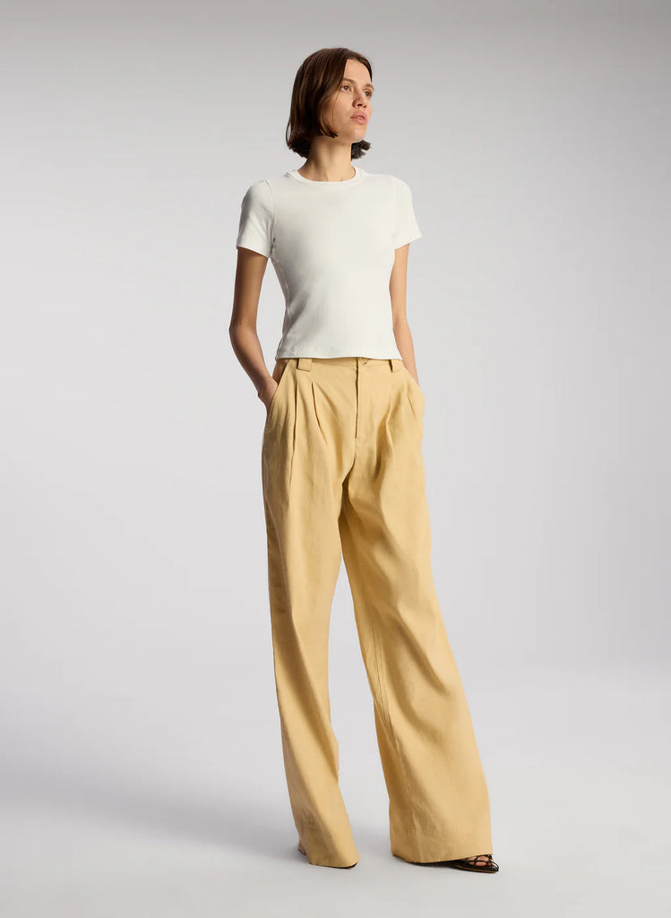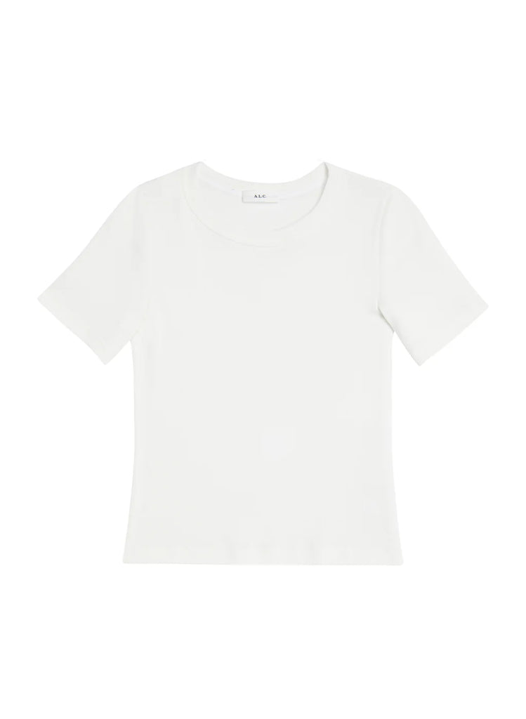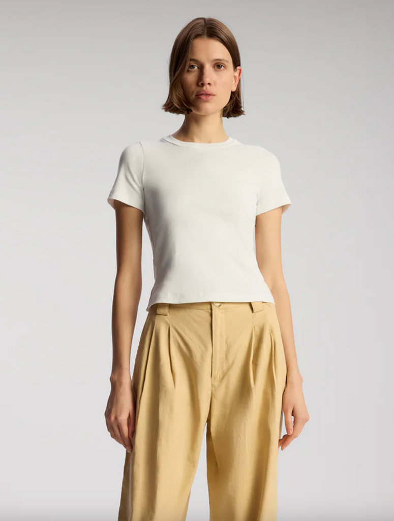 The Paloma Tee is crafted from soft ribbed cotton fabric in a maritime navy hue. This fitted silhouette is a modern staple designed for repeat wear, featuring a crew neckline and cap sleeves.