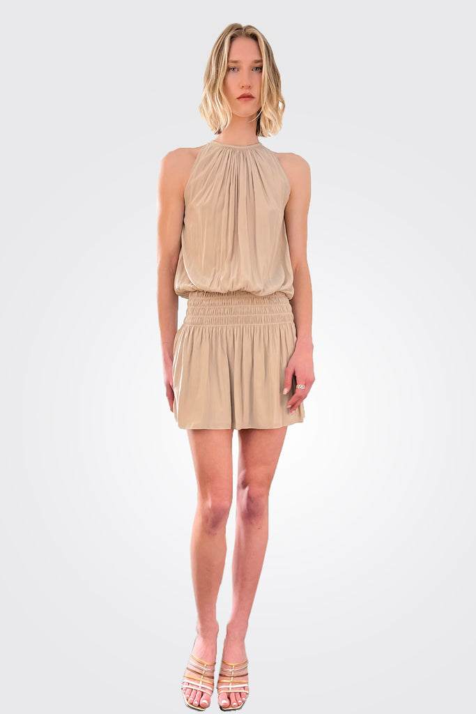 Featuring a comfortable smocked waist, a high-neck blouson bodice and gathered skirt, this minidress is rich with date-night charm.