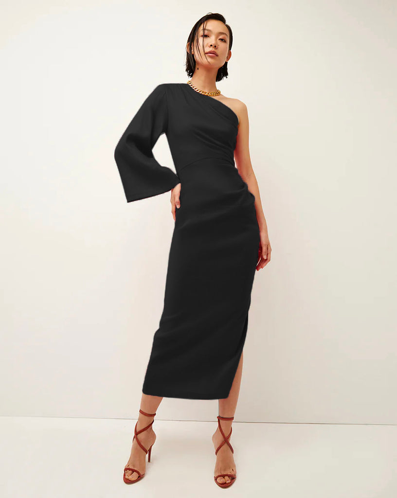 The Patsy is all drama and high impact—a body-skimming sheath with a striking one-shoulder silhouette. Expertly crafted from a lightweight linen blend, the maxi dress features our signature side ruching and a side slit for a figure flattering finish. Metallic threading, meanwhile, adds an unexpected element of shine. Wear with flats for casual look or switch to heels for nights out—it’s perfect for vacations, weddings and everything in between.