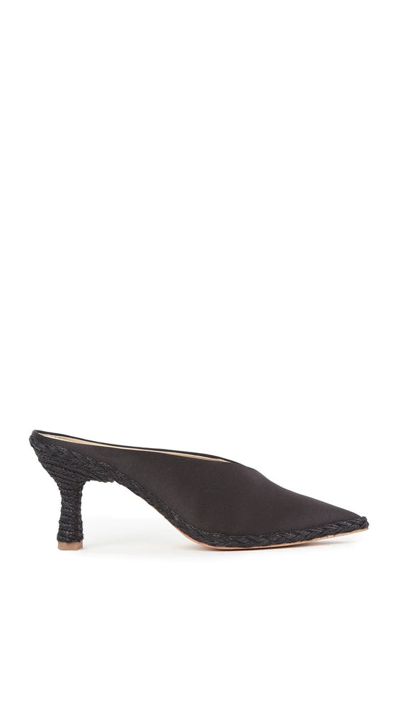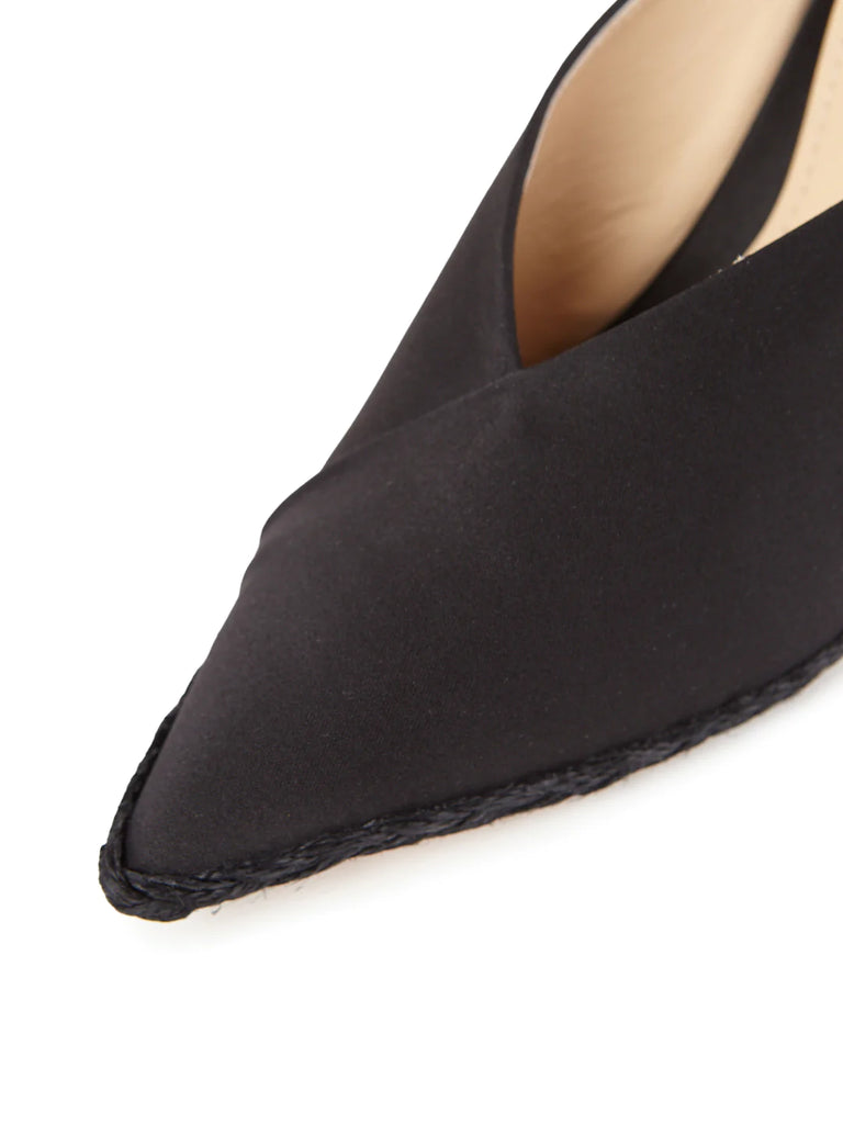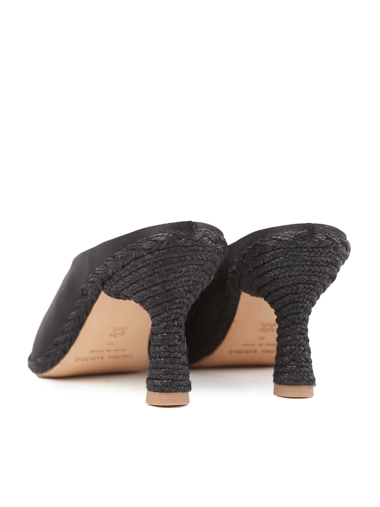 The Penny | Satin Black sandal features a 100% textile upper with a leather sole and non-slip grip. The heel is wrapped in matching jute for added style and comfort.