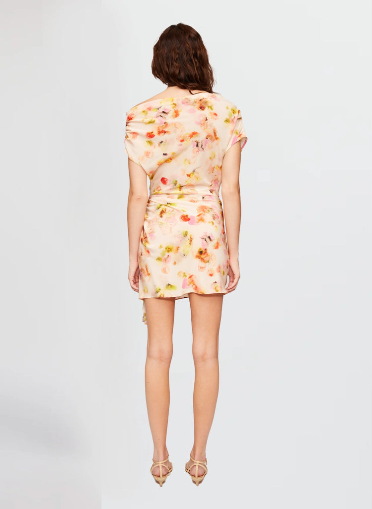 The Poppy Dress is crafted from our silk fabric. This mini silhouette features a draped neckline with ruched detailing that sits off one shoulder. Gathering along the curved seam through the hip creates another focal point, flowing into an asymmetrically draped hemline with beautiful movement.