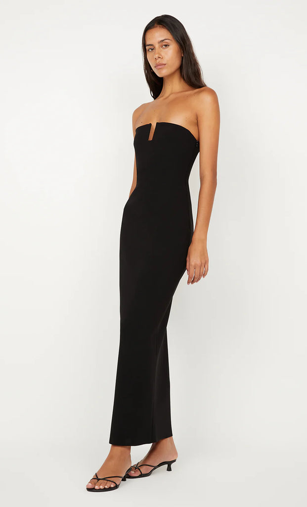 This sophisticated strapless maxi dress, crafted from stretch bonded crepe, features a modern U-shaped neckline and a sleek silhouette, perfect for formal events, a wedding guest ensemble, or an elegant evening.