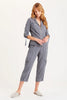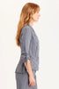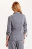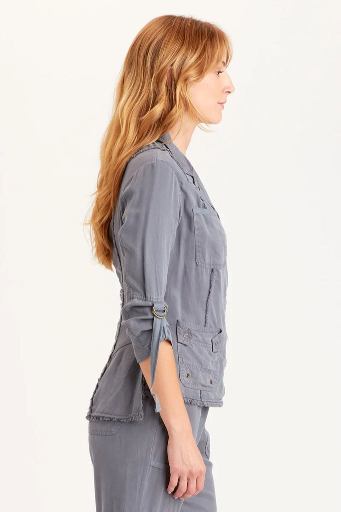 Hardware and raw edges are highlighted in our Raphael Blazer. Fabric mixed contrasting panels, eyelets along the lapel and pocket edges, plus brass D-Ring and tabbed sleeves are just a few of the details thorughout this interesting jacket.