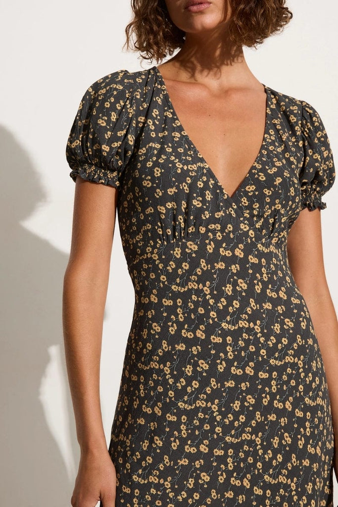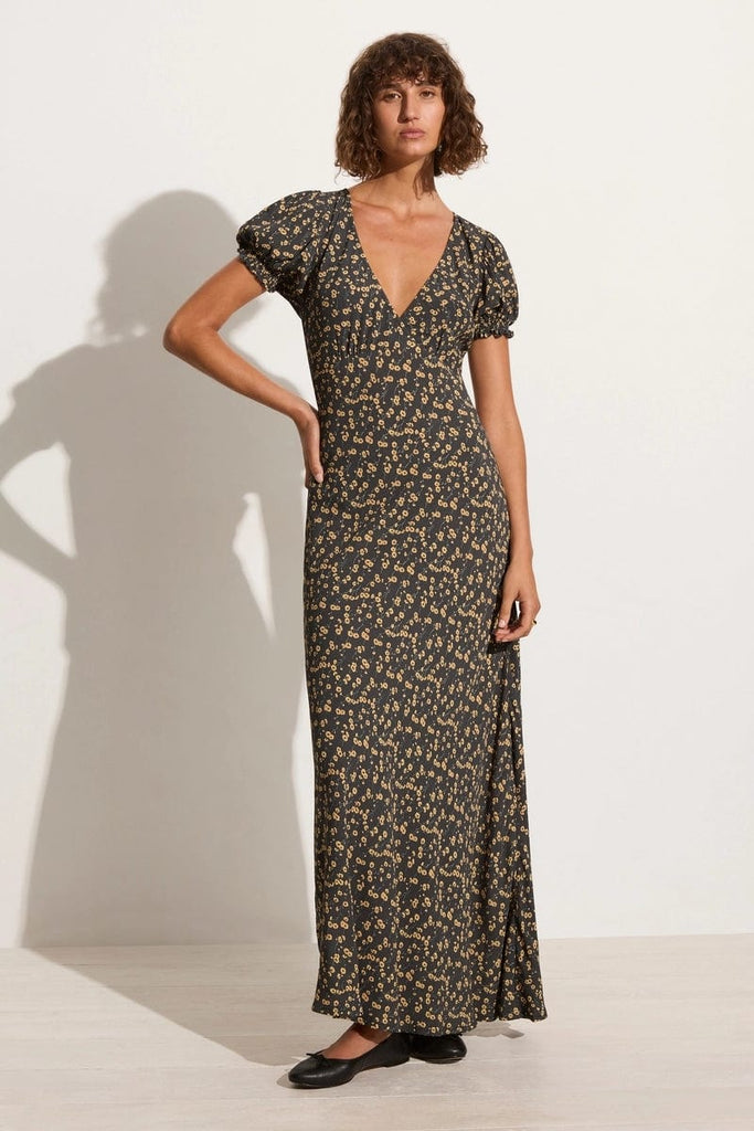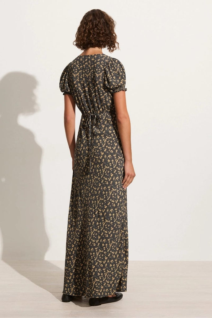 Arrive in style to your next occasion in the Reis Maxi Dress in Flori Floral Print. A bias cut full length silhouette boasting short puff sleeves, cross over front bodice, fixed waist with tie and a bias cut skirt. Cut from lightweight rayon crepe and hand-printed with small blooms for a feminine finish, the Reis is an elevated event or date wear style.