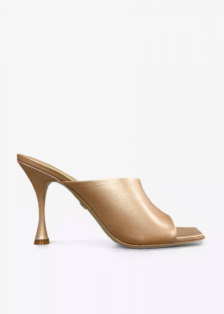 Heeled sandals for women Lola Cruz in leather. Style name Rika with metallic leather and open toe pin heel of 9,5 cm aprox. High ( more of 2 inch.) square toe tip