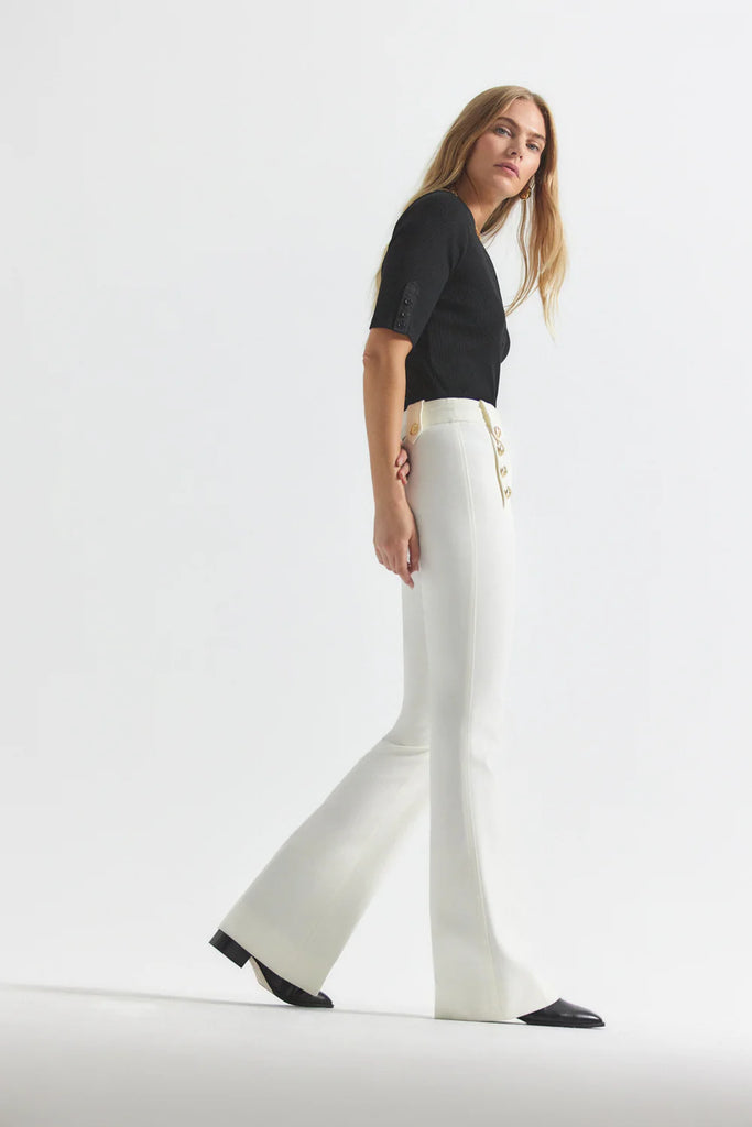 The cult-favorite flared twill trouser with gold-tone sailor button details along the hips. Zip fly with button closure, flat front, tonal belt loops and stitching.