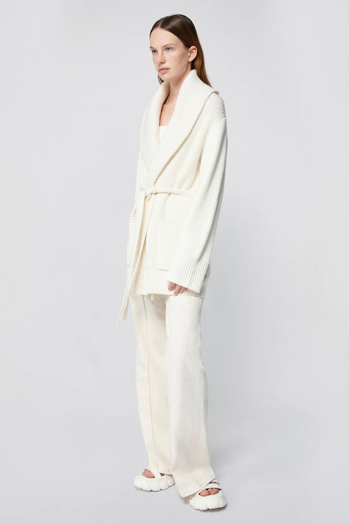 The Romani Cardigan in Ivory. Envelop yourself in a cocoon of softness with this generously draped piece. Featuring an elegant shawl collar and a defining waist belt, this piece is perfect for moments of relaxation or sophisticated layering.