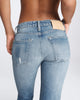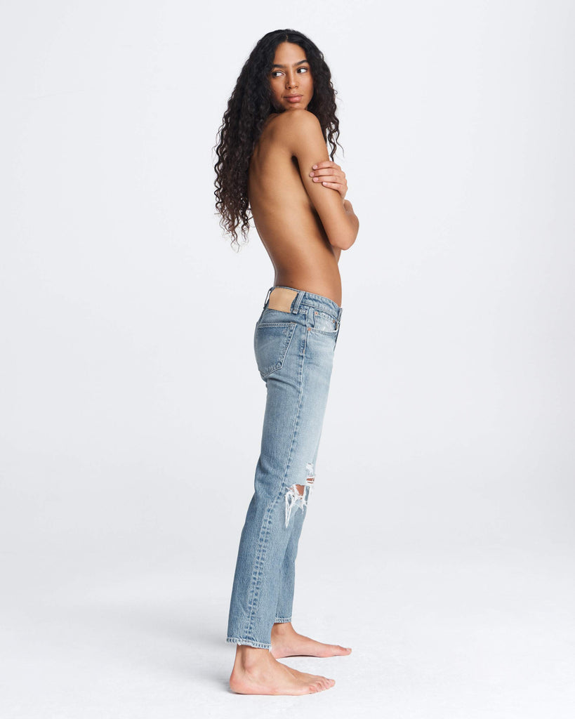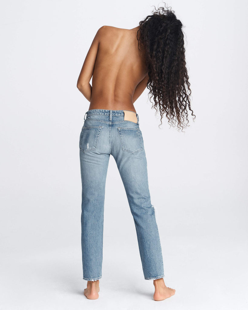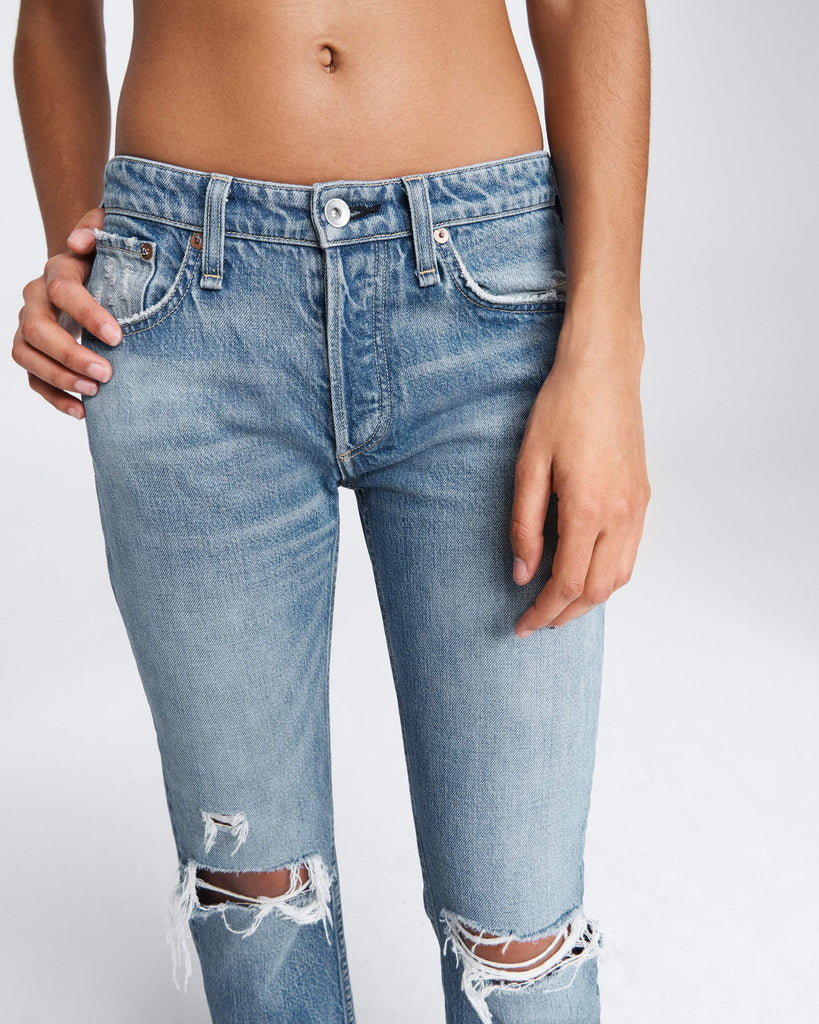 13 ounce Turkish rigid denim in a mid indigo wash with destruction