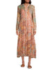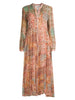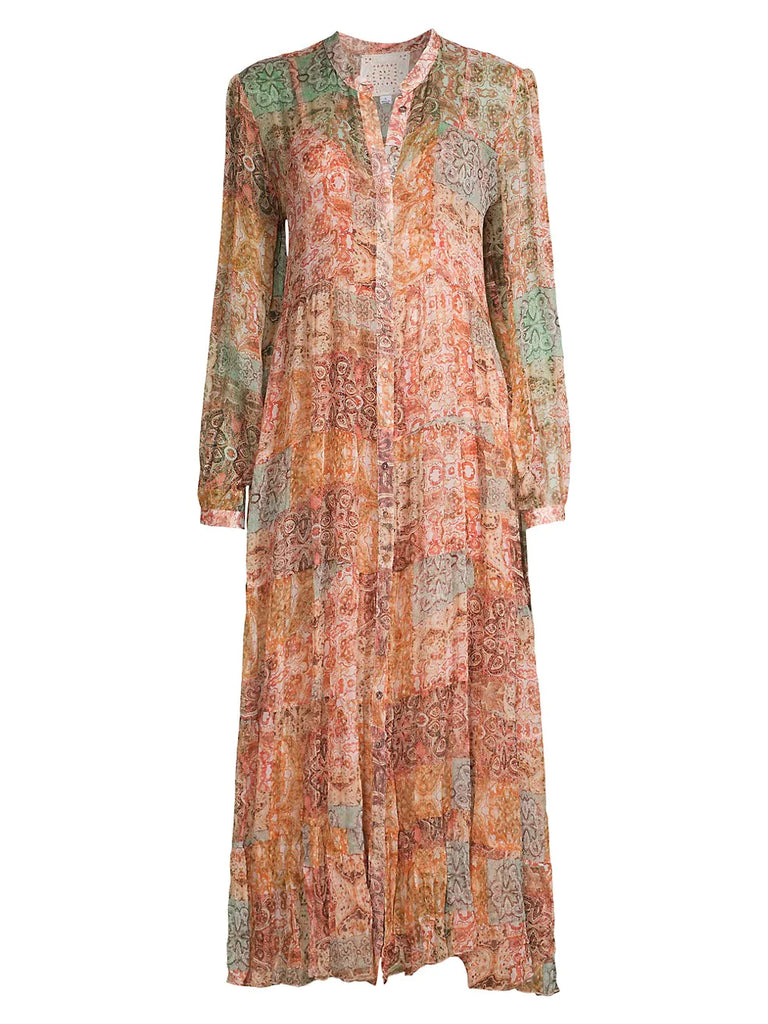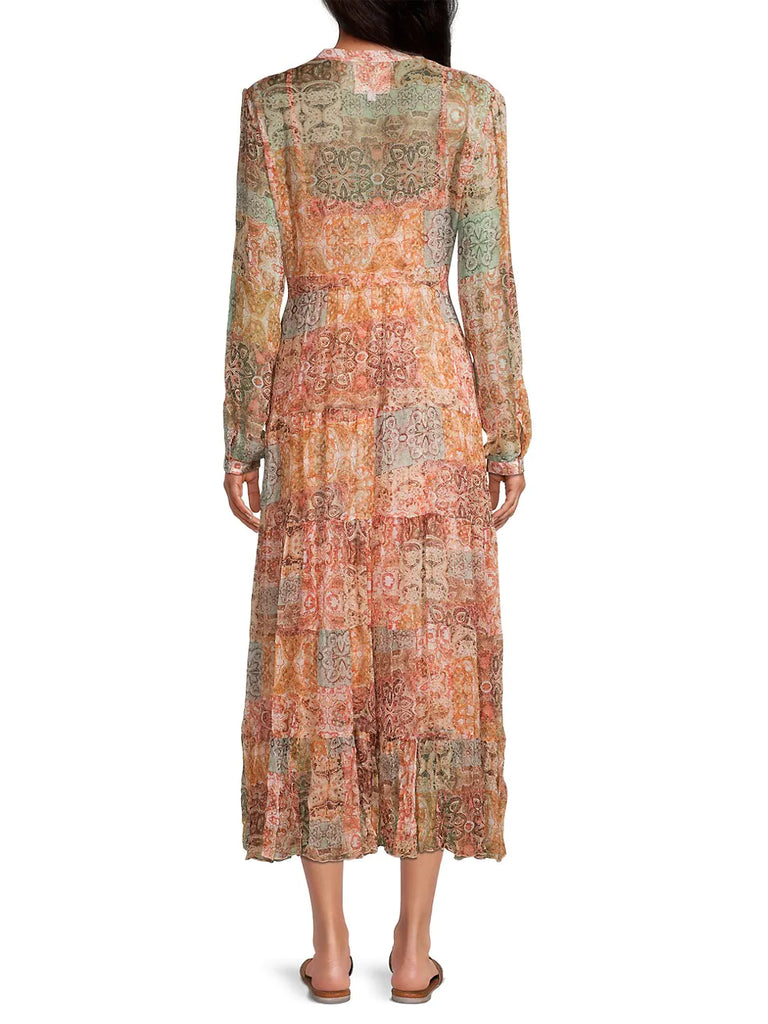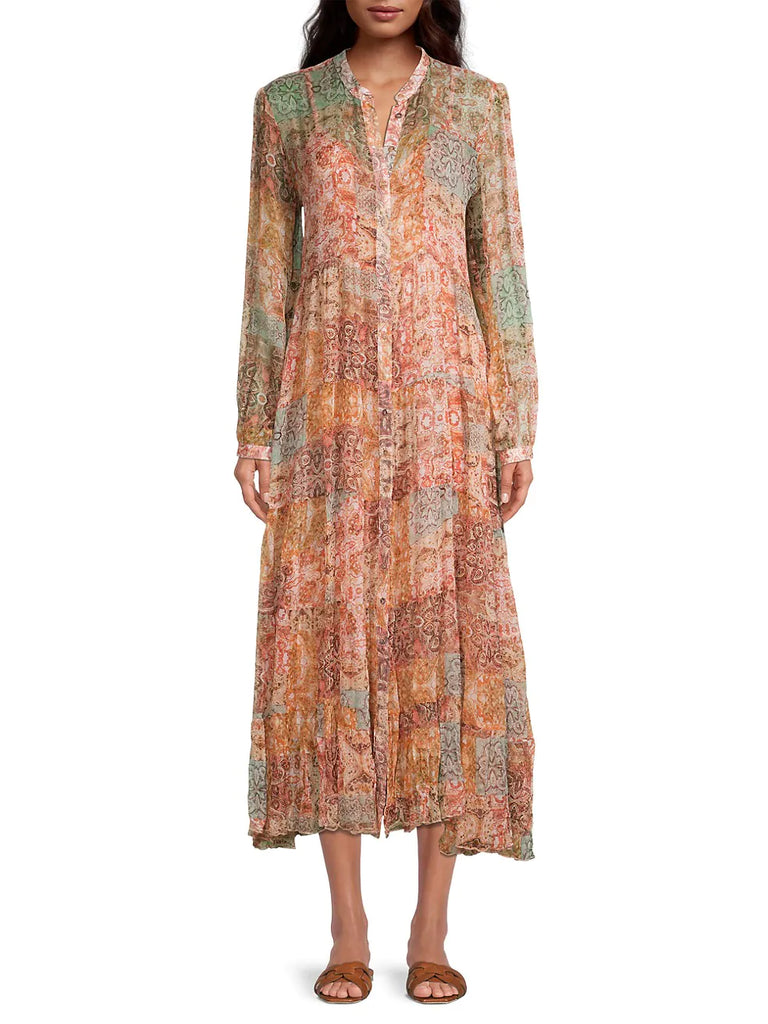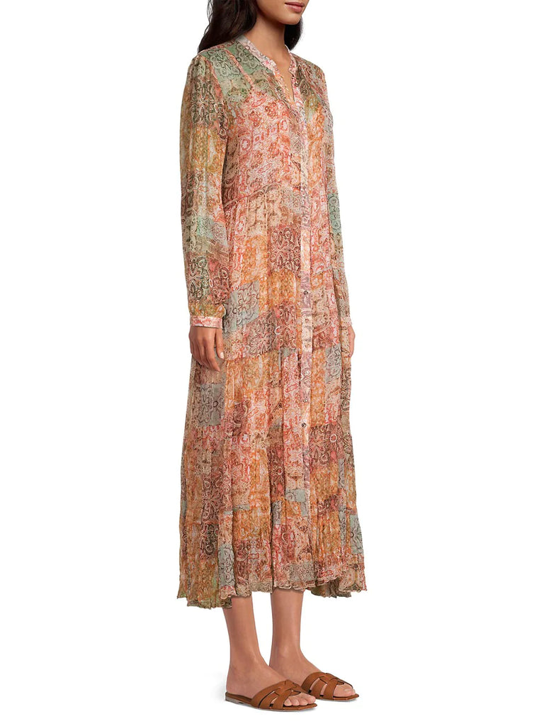 Crafted of luxe silk, Johnny Was' Sabrina midi-dress boasts a structured band collar and long balloon sleeves. This piece’s tiered abstract patterning is offset by an asymmetric ruffled hem.