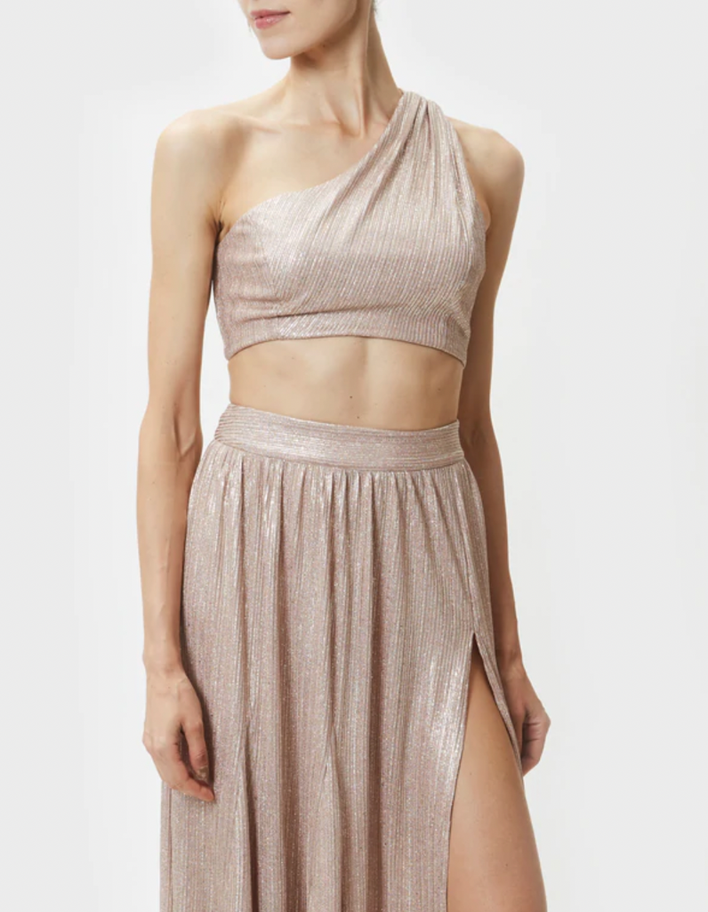 Crafted from a shimmering metallic fabrication, this cropped top has a pleated stretch silhouette.